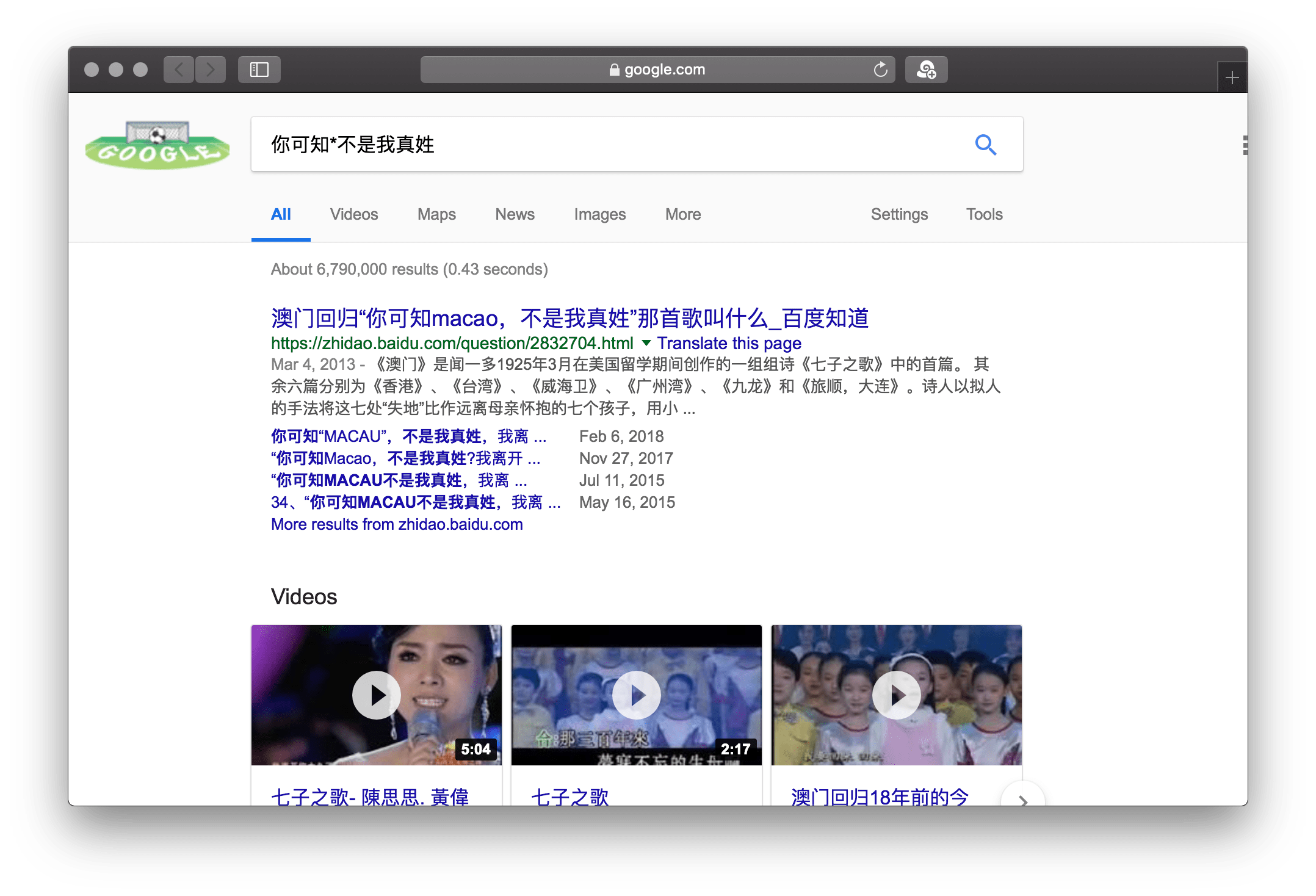 *关键词:用星号 * 代替你想搜索的内容,拿来查歌词很好用,比如用 你可知*不是我真姓 就能查到完整的歌词 你可知 Macau 不是我真姓。