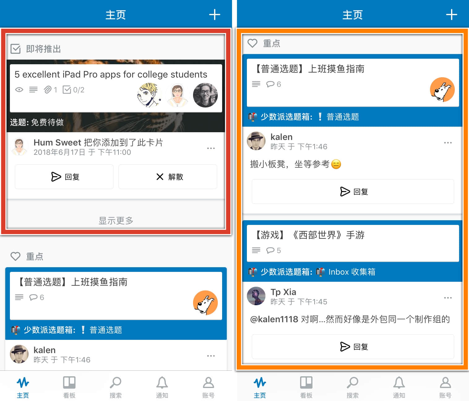 「主页」的第二部分是「重点」,里面包含了所有发生过对话的卡片。这部分的实用性我也认为一般,因为不是所有团队成员都需要关心整个团队所有的卡片对话和进展。