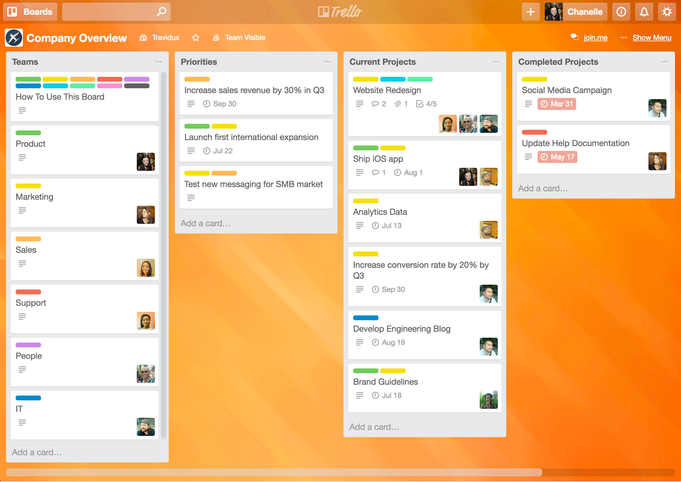Trello 是一款在线协作服务,常用在团队之间作为项目管理工具。它最大的特点是将「看板」的概念融进工具中:每项任务都是一张卡片,卡片之上的层级是列表,多个列表则组成一个看板。