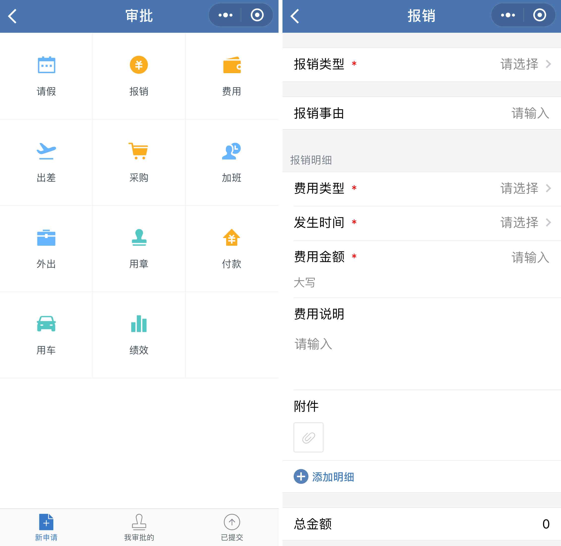 从图里我们可以看出这个报销功能还是很全面的,有必输项也有可选项,未展示在图中的其实还有审批人和抄送人。