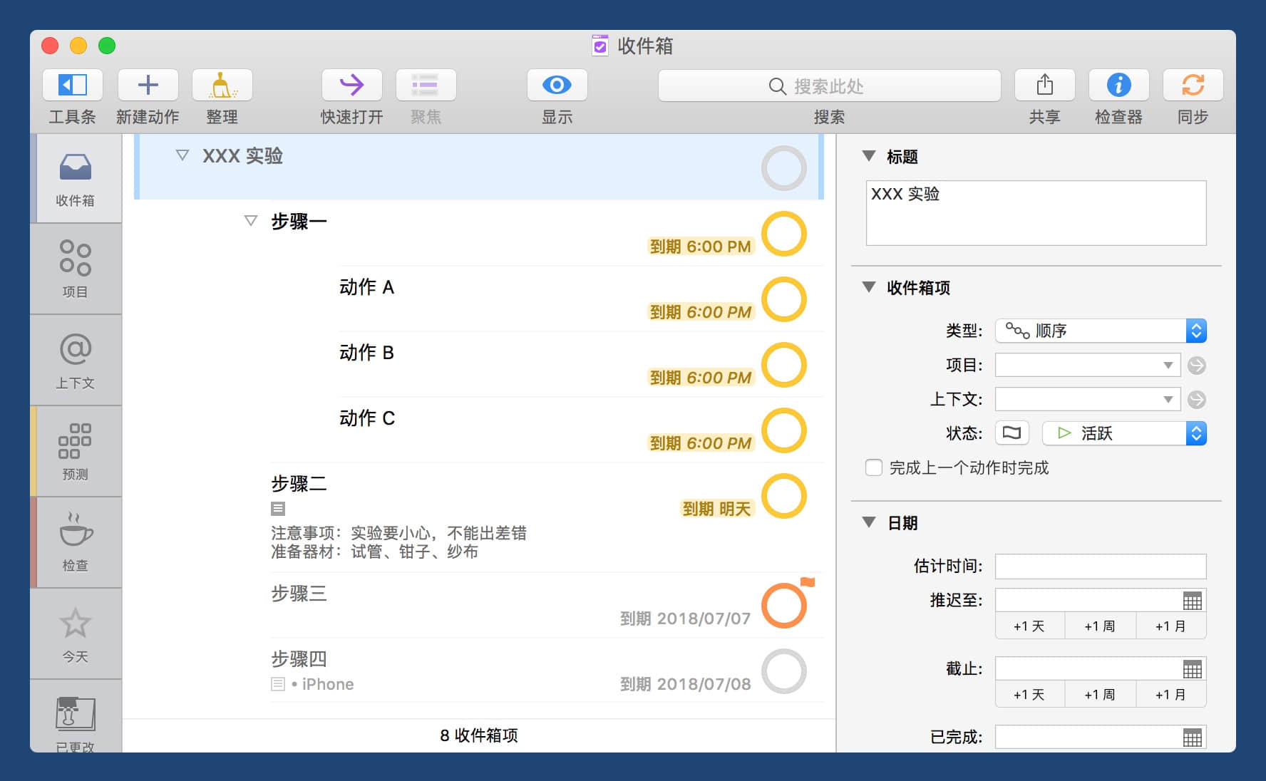 科研工作者,经常会做一些重复性的实验,实验流程都需要持续好几天。我一般会把每个实验在 OmniFocus 中建立一个项目,然后把步骤作为动作。 但是每次做同样实验的时候总要重新建立一遍、或者在已完成里面扒出来重新设定日期。