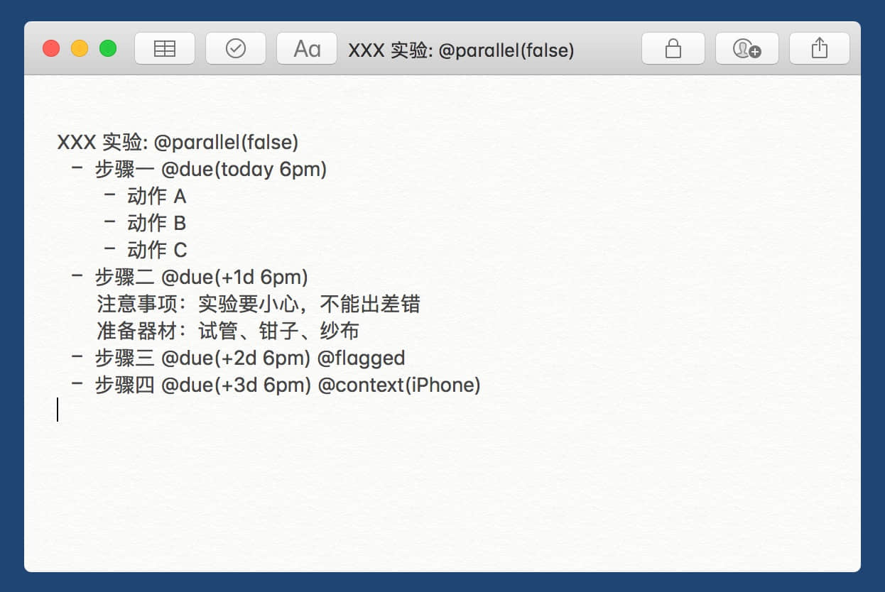 所以如果你需要为项目里的每个任务分别设定截止日期,那么就得借助一种叫做 TaskPaper 的格式来实现。简单来说 TaskPaper 是一个基于纯文本的任务管理工具,它有一套特殊的为任务添加属性的语法,比如一个截止日期为今天的任务在 TaskPaper 里描述为: