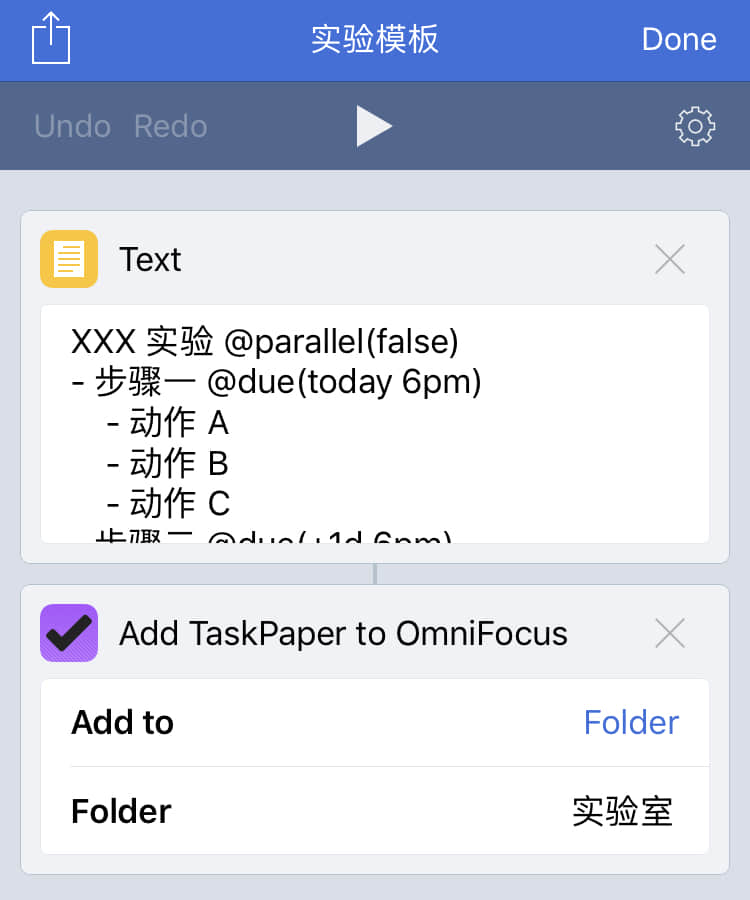 如果你嫌弃「粘贴到 OmniFocus」这一步比较麻烦的话,而且还需要手动转换任务为项目。那么,可以借助 Workflow 中的「Add TaskPaper to OmniFocus」来优化添加流程。