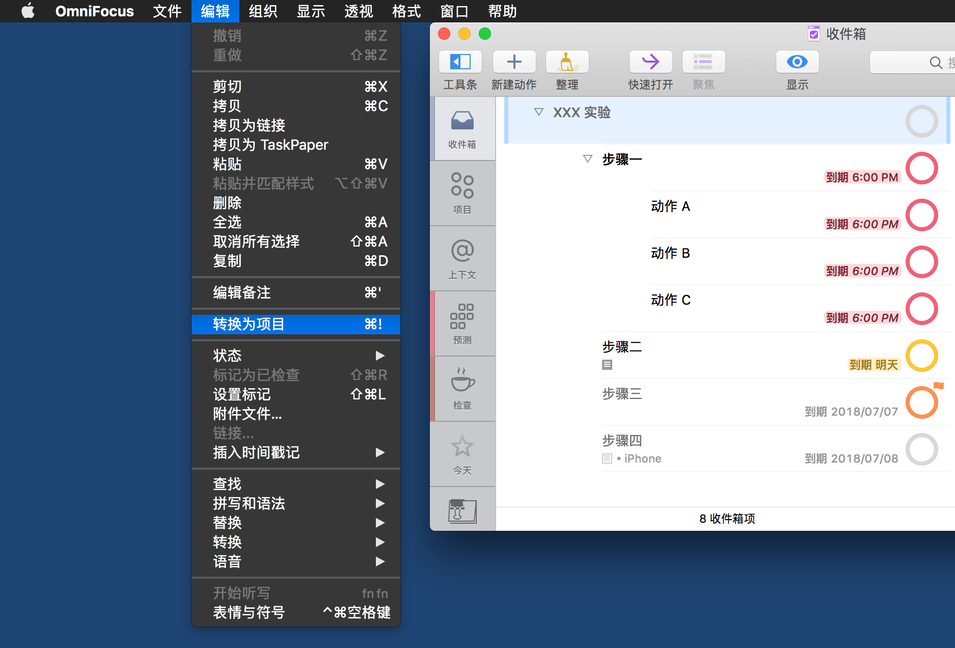 如果你将这段文本直接粘贴到 OmniFocus 的收件箱中,会发现第一行的「XXX 实验」会变成一项普通的任务,而不是项目。此时你只需要选中任务,然后在菜单栏里选择「编辑 - 转换为项目」就可以把任务变成项目了(iOS 的转换按钮在「任务检查器」的底部)。