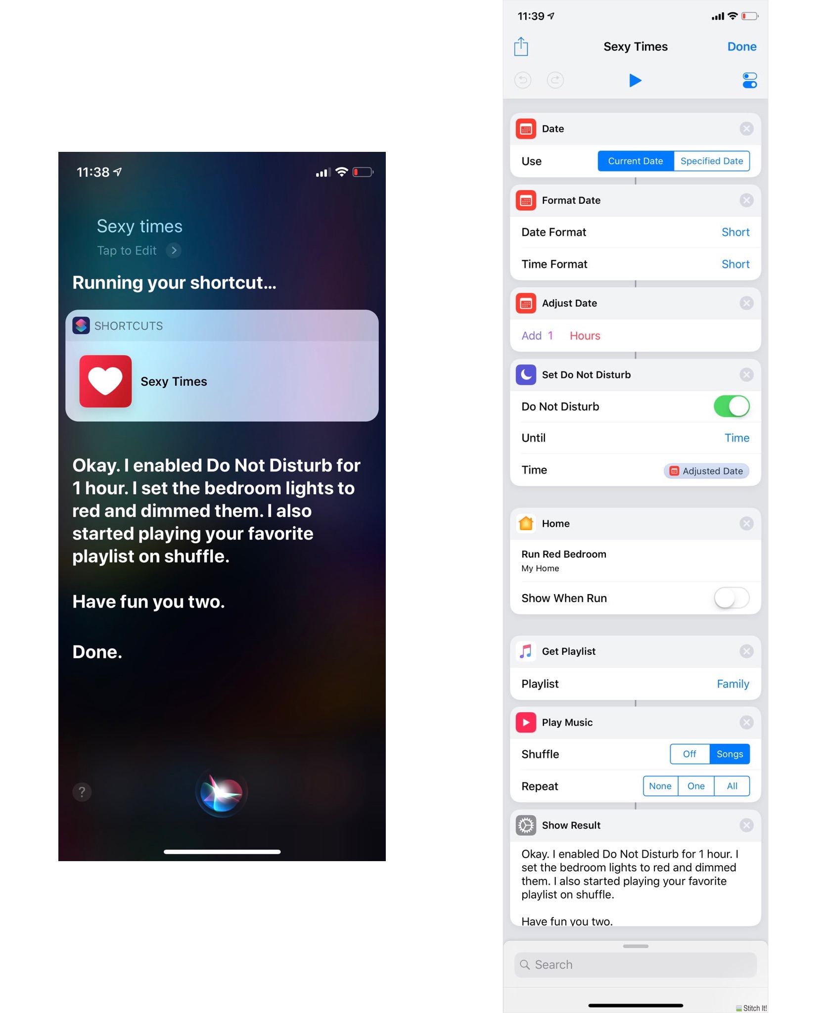 Shortcuts 由于有苹果爸爸的加持,获得了很多第三方应用无法企及的权限。比如在 Federico Viticci 展示的这个例子里,他打开了一个小时的勿扰模式时间,然后通过 Home 应用将灯光调至红色,再通过 Apple Music 播放歌单,最后在 Siri 中展示信息。