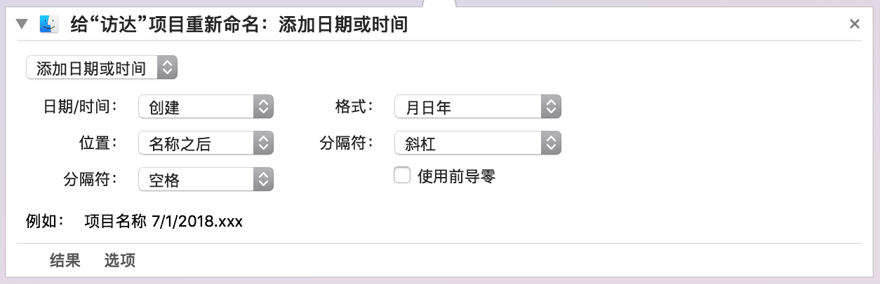 虽然 Finder 也有添加日期后缀的功能,但它的格式实在让中文用户难以适应——2018 at 09/17/40 AM,你一眼看得出来这是什么日期和时间吗?我们更习惯的,是 2018-07-04 或 2018/07/04 这类简明的年月日表示方式。而 Automator 则可以自己指定年月日的顺序,打造出你需要的样式。
