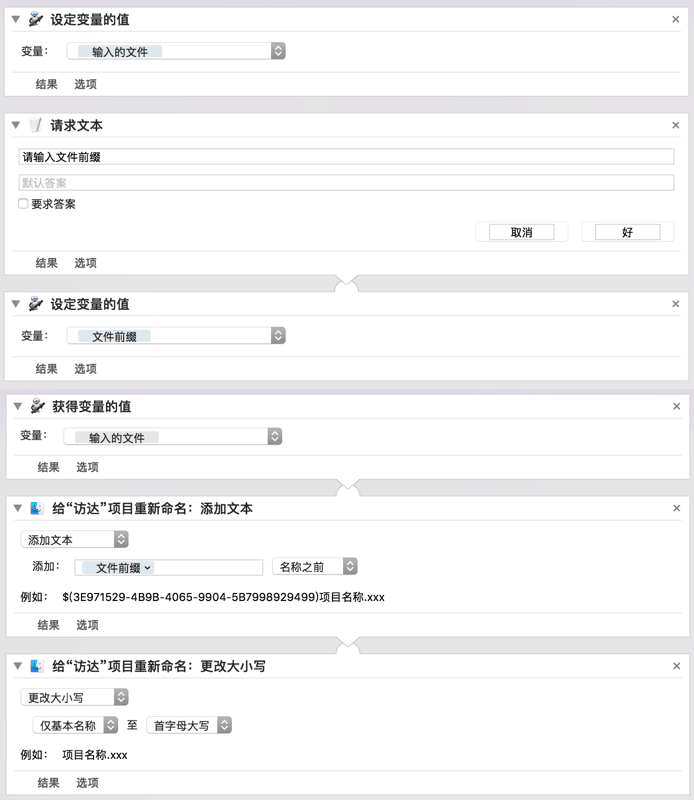 于是我做了一个 Automator 小工具,帮他解决文件批量重命名的需求: