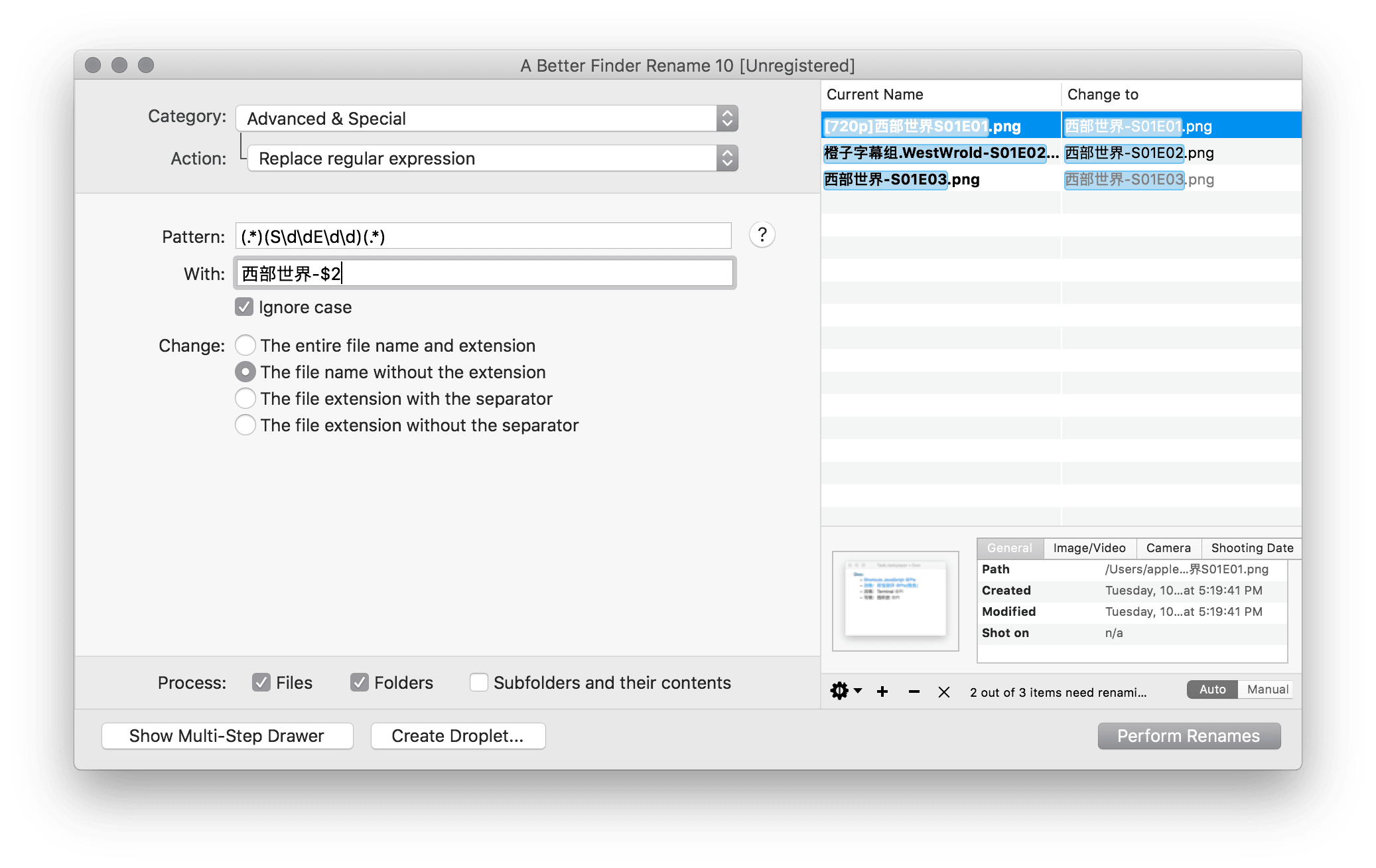 要用正则表达式的话,先介绍一个现成的批量重命名工具:A Better Finder Rename 10。你可以直接使用「Advanced & Special - Replace regular expression」,填入 Pattern(需匹配的样式)(.*)(S\d\dE\d\d)(.*) 和需要换上的文本(With)西部世界-$2 。右边就是替换后的文件名预览: A Better Finder Rename 10 界面
