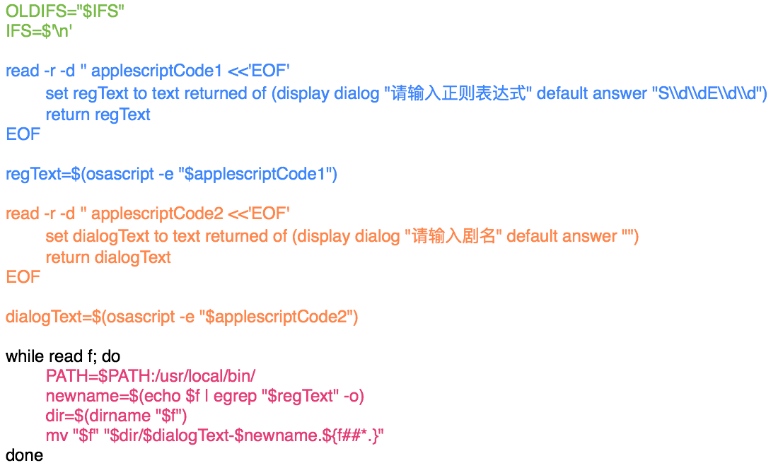 运行这个 Automator 期间会弹出两次输入框,第一次是让你输入正则表达式,默认是 S\d\dE\d\d。你可以在弹出的输入框里把 S\d\dE\d\d 改成别正则表达式,来满足不同场景的需求。第二次则是让你添加剧名作为前缀。