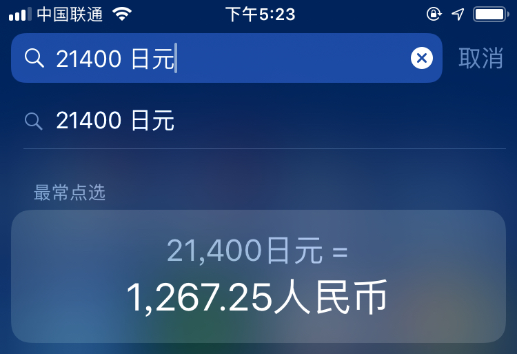 我最常用的汇率换算工具其实是 Spotlight。我们换算汇率的场景大多数是这样的:看到一个商品的价格,比如是 21400 日元,然后解锁 iPhone(现在 iPhone 解锁速度都很快了),下拉主屏激活 Spotlight,直接输入「21400 日元」或「21400 JPY」,就能得出换算结果,非常方便。