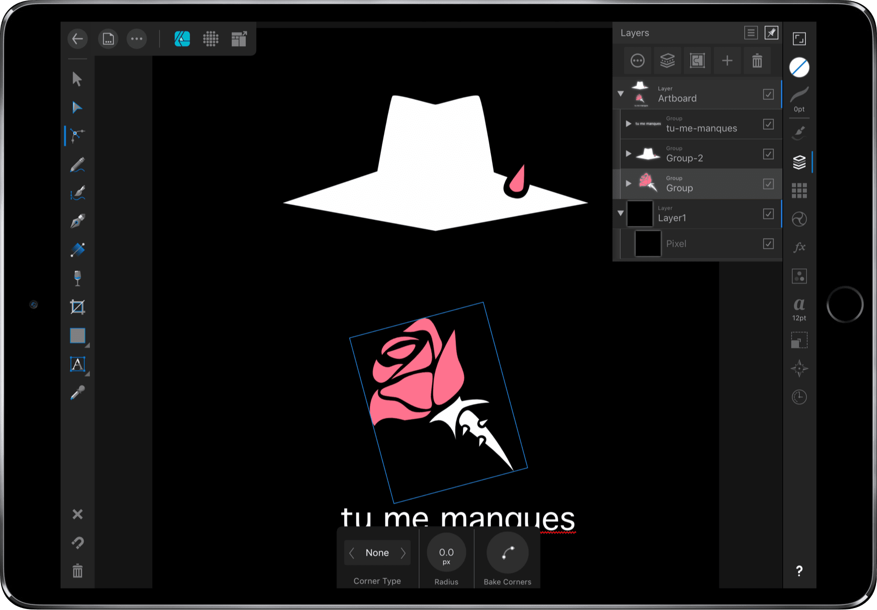 桌面级的功能也不能忽视。Affnity Desinger 采用了经典的桌面端布局,左侧工具栏、右侧供调整细节,不过碍于屏幕尺寸,如图层、色调等调整的窗口需要手动选择才能弹出,好在 Affinity Designer 对触摸屏进行了优化,比如滑动选取/取消选取图层,就可以通过轻划完成操作,少让我抬起手臂,真的像在用一支笔写写画画。