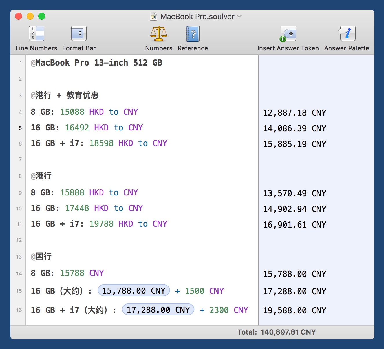 如果我需要记录以及对比汇率结果,比如今天苹果刚发布了新款的 MacBook Pro,我在对比不同配置之间的价格,以及港行和国行的对比。这时候我用到的工具是 Soulver,iOS 和 macOS 平台都有,可以方便地用文字输入的方式写下价格和货币,然后进行转换对比。 用 Soulver 对比 MacBook Pro 的价格