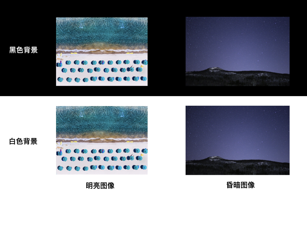 在处理较为昏暗的图片、影片时,深色背景和图像、影像共同形成近似昏暗的环境,瞳孔自发增大,接受光线能力更强,方便处理这类图像、影像。假如使用浅色背景,虽然对比度的提高能突出图像、影像,但在明亮的环境下,人眼会减弱感光程度,影响对色彩的感知和细节的把握。
