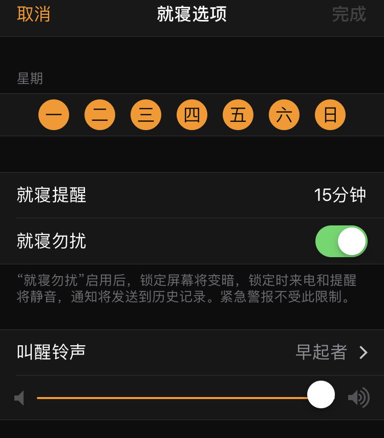 就寝勿扰模式下,锁屏界面会变暗,来电会静音,所有通知都会直接发送到消息中心,不出现在锁屏界面。在时钟应用的就寝选项卡中,可以设置就寝时间内自动打开就寝勿扰。