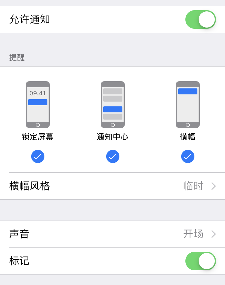 一般通知:开启暂时横幅、标记与锁屏界面显示;