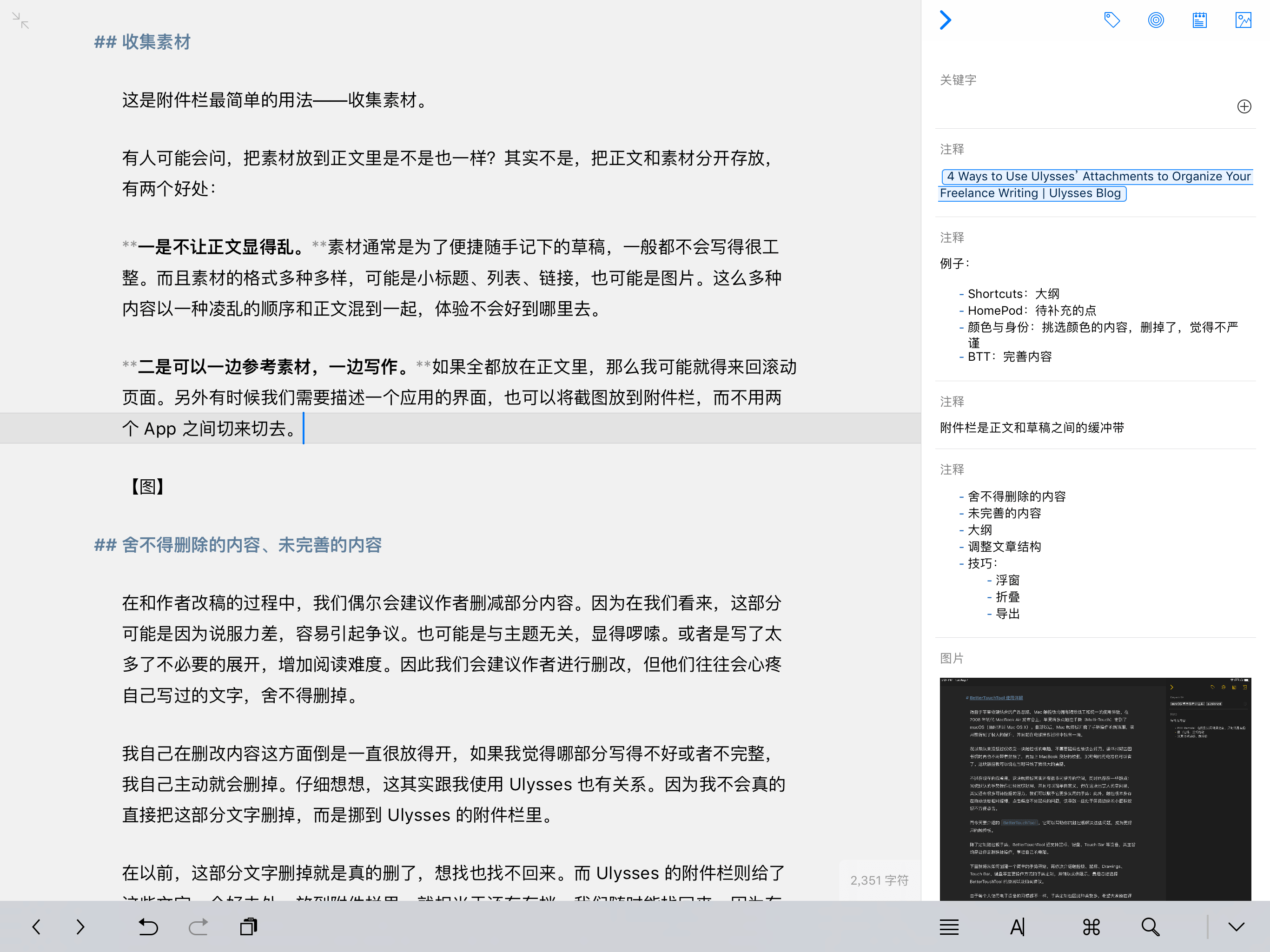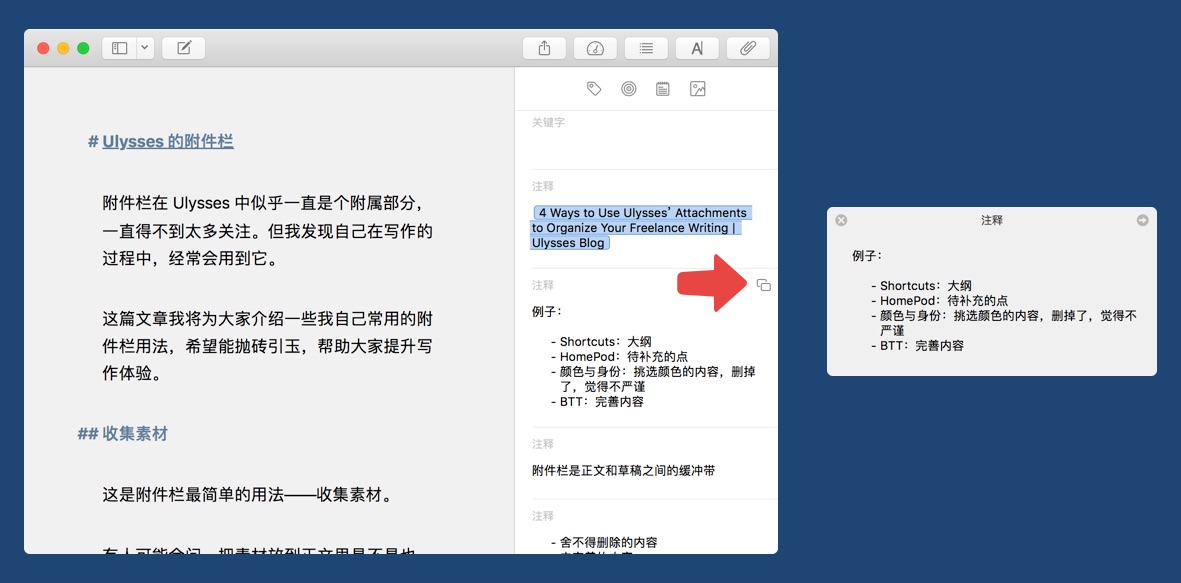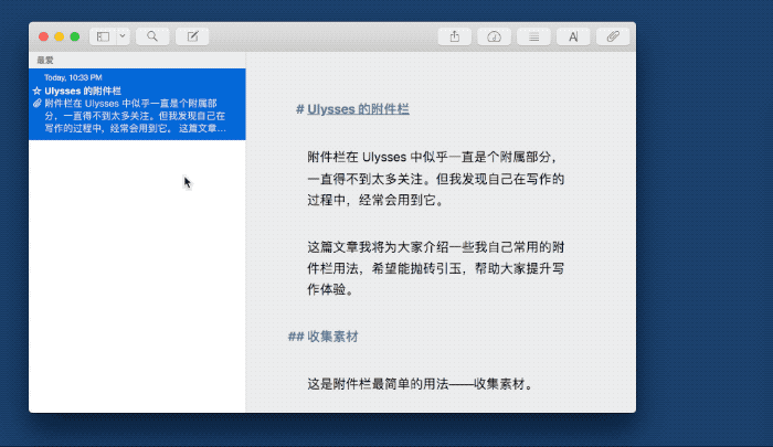 附件栏在 Ulysses 中似乎是个附属部分,一直得不到太多关注。但我发现自己在写作的过程中,经常会用到它。