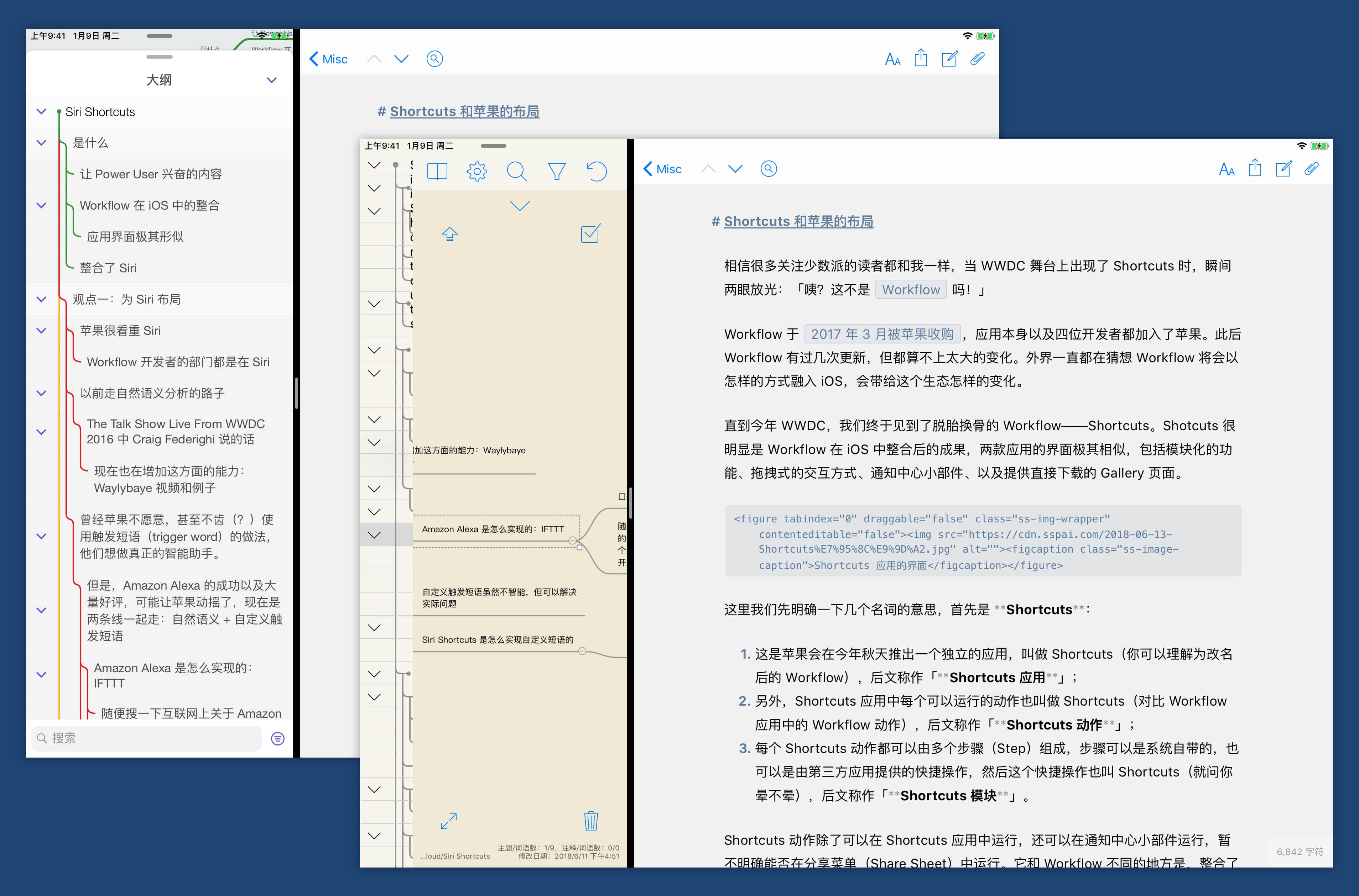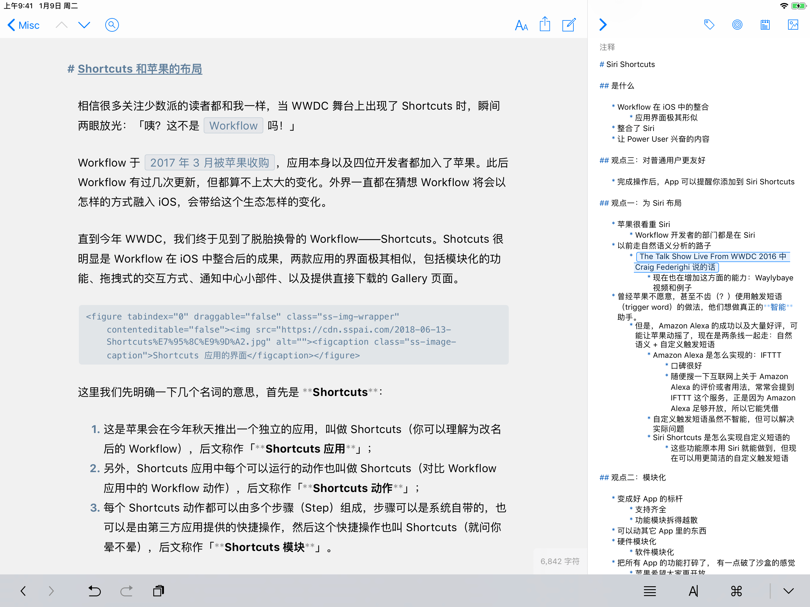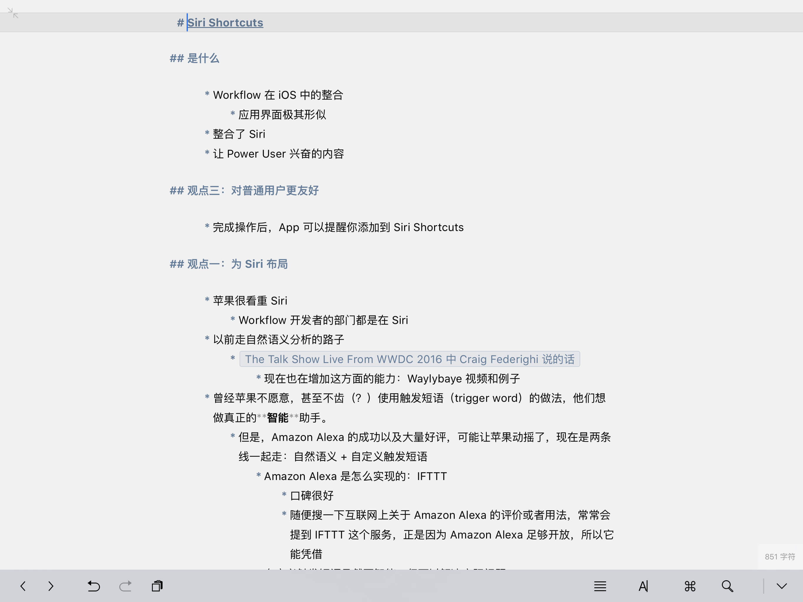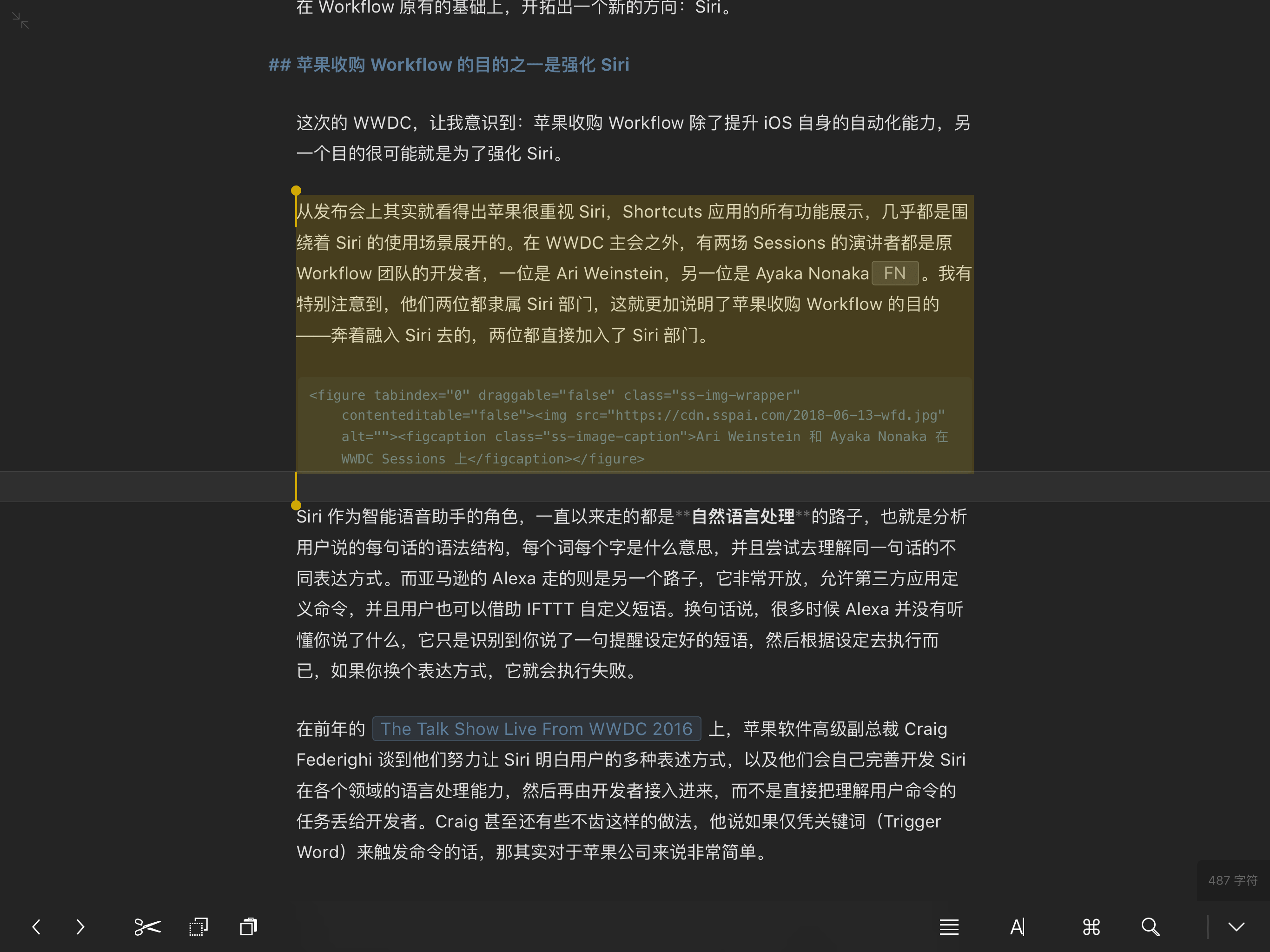 我在写《Shortcuts 与苹果的布局》这篇文章的时候,一开始介绍了 Shortcuts 应用的来源以及它各种相关名词,还有 Shortcuts 的几种交互方式。最初的版本里面,我还将「Workflow 两位开发者加入了 Siri 部门」的部分(包括配图)也写在了开头,但我很快就发现这样会让开头很臃肿。同时我又仿佛觉得后面可能会用到这个点,因此就将这部分先挪到了附件栏,然后再接着往下写。当我写到「苹果收购 Workflow 的目的之一是强化 Siri」时,就发现之前挪出来的内容可以作为论据,因此就很自然并到这部分里了。 附件栏的小技巧