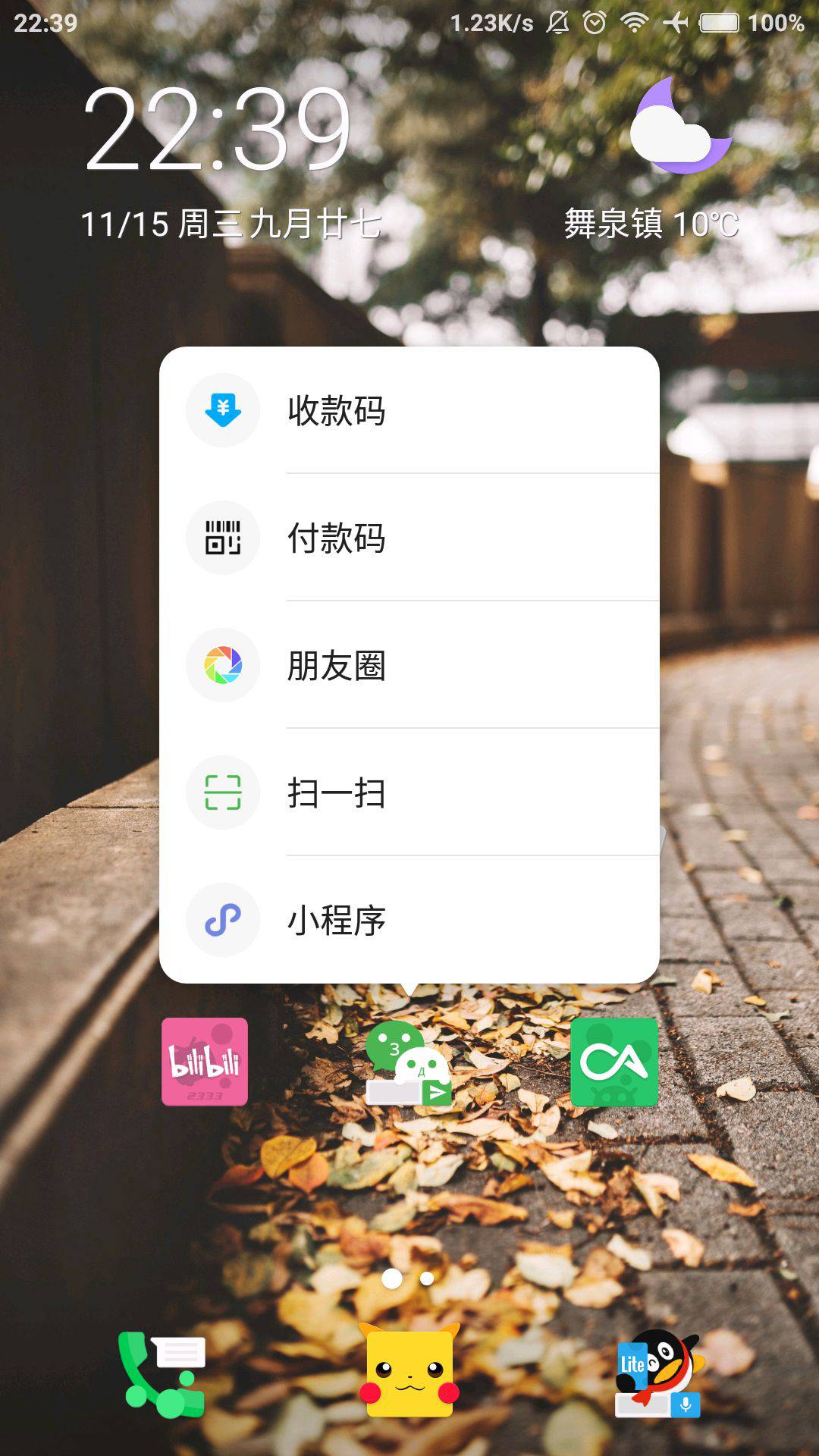 要实现这个要求我们先下载一个简单的应用 —— Qpay。它集成了微信,支付宝,QQ 上付款和扫码相关的快捷方式,无需打开相关应用就可以调用它们相应的功能。由于 Qpay 提供了一个桌面小部件,所以用只需要在微信快捷方式上用上面方法设置上滑呼出 Qpay 的小部件就可以实现类似给微信添加 App Shortcut 的功能啦,十分地简单。