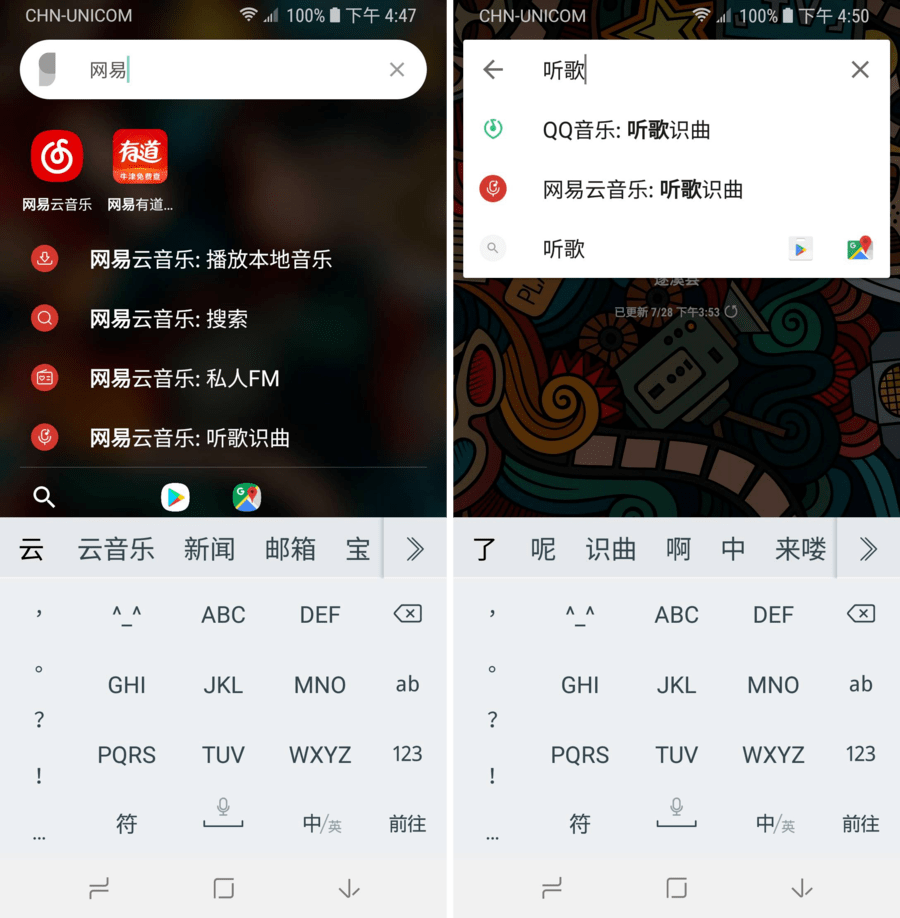直接输入应用名称或快捷功能名称(例如:听歌识曲)就可以查看相应应用的快捷菜单,这样子不仅可以快速直达自己想要的功能,还能免去找出图标长按的过程,效率进一步提高。