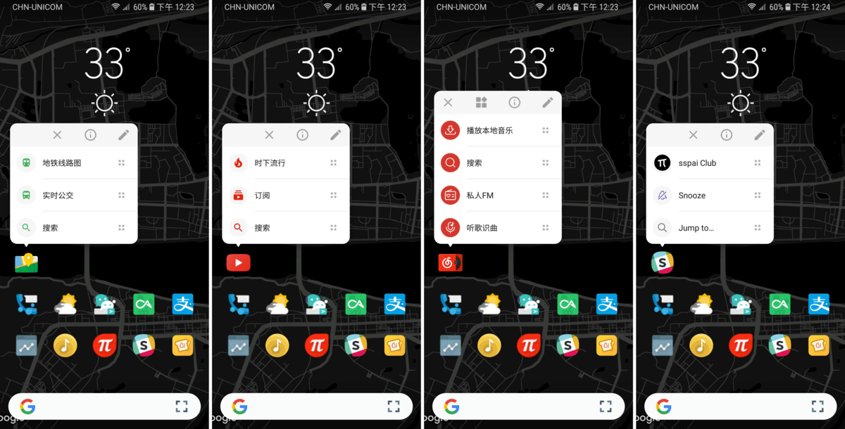 最终实现的效果就是桌面快捷方式可以启动应用,长按弹出快捷菜单,上滑弹出小部件。可谓全面实现了 3D Touch 的功能。