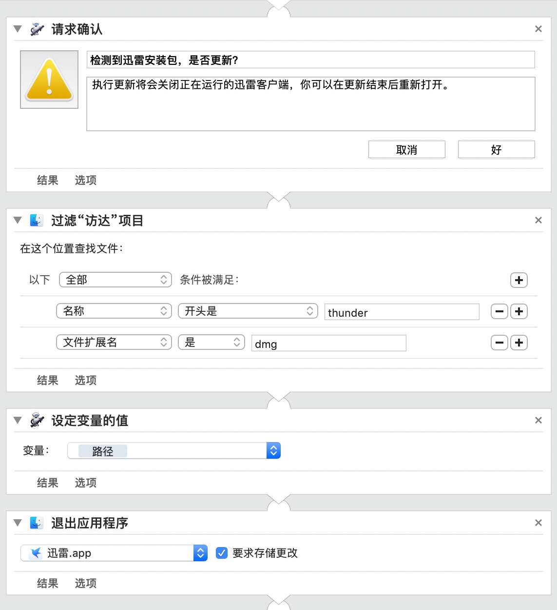 迅雷 App 内部文件夹不能作为触发条件,不过我们还可以找到一个只有更新迅雷时会有新项目产生的外部目录。这时,一个想法映入我的脑海:能不能找到迅雷更新器的缓存目录呢?在查看迅雷更新产生的磁盘映像后,我发现迅雷更新的缓存目录并不是随机生成的。它位于 ~/Library/Application Support/Thunder/upgrade (~ 代表当前用户目录,在 macOS 下一般是 /Users/{你的用户名}),下载的磁盘映像文件名为 thunder_{版本号}.dmg。我们接下来将运用这些完成对迅雷内置更新器自动化的设置。