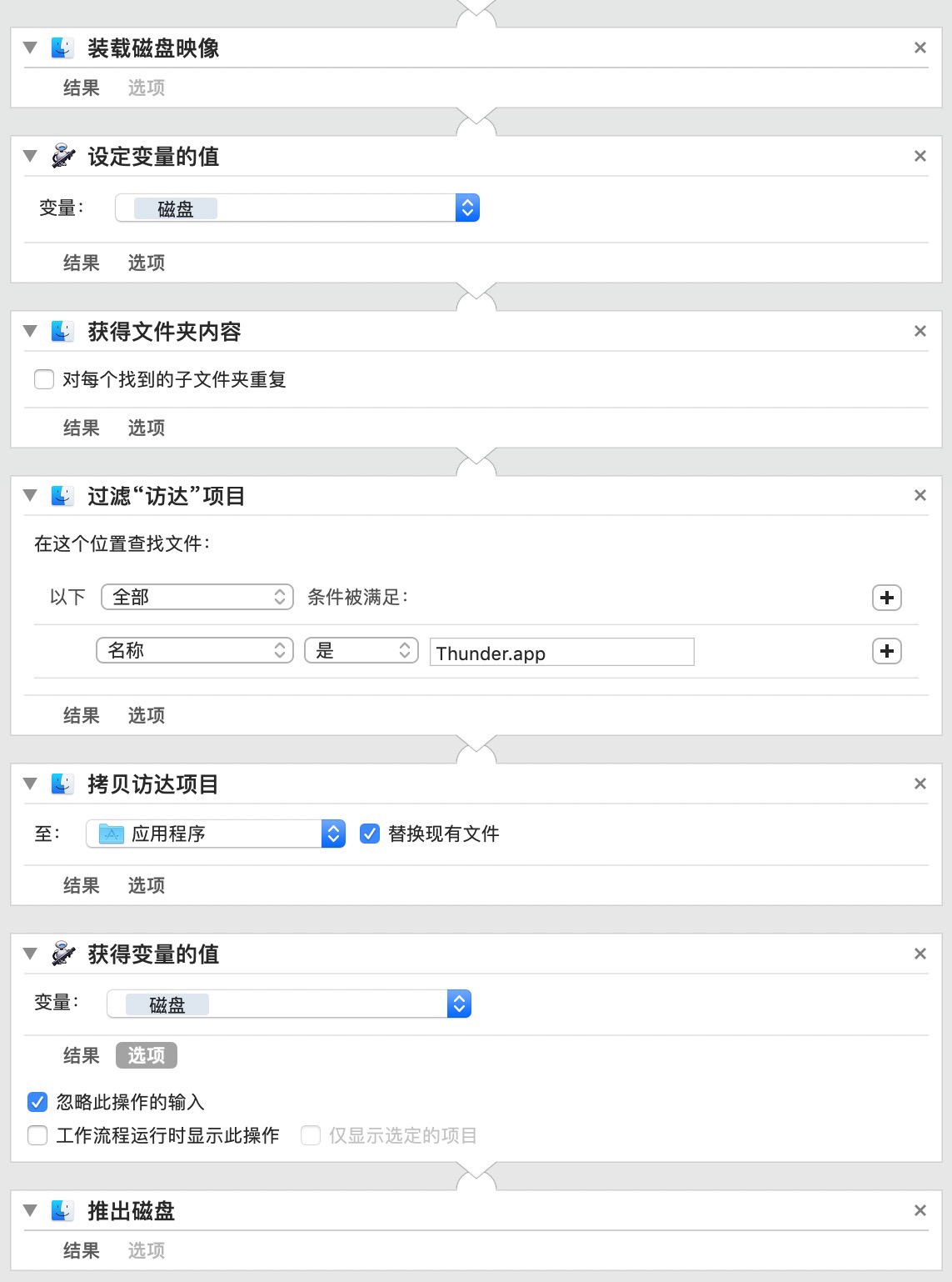在上一阶段的工作流程中,除了筛选之外的步骤都没有改变当前变量的值,进入这一阶段时工作流程中传递的变量应该是 DMG 格式的迅雷安装包。