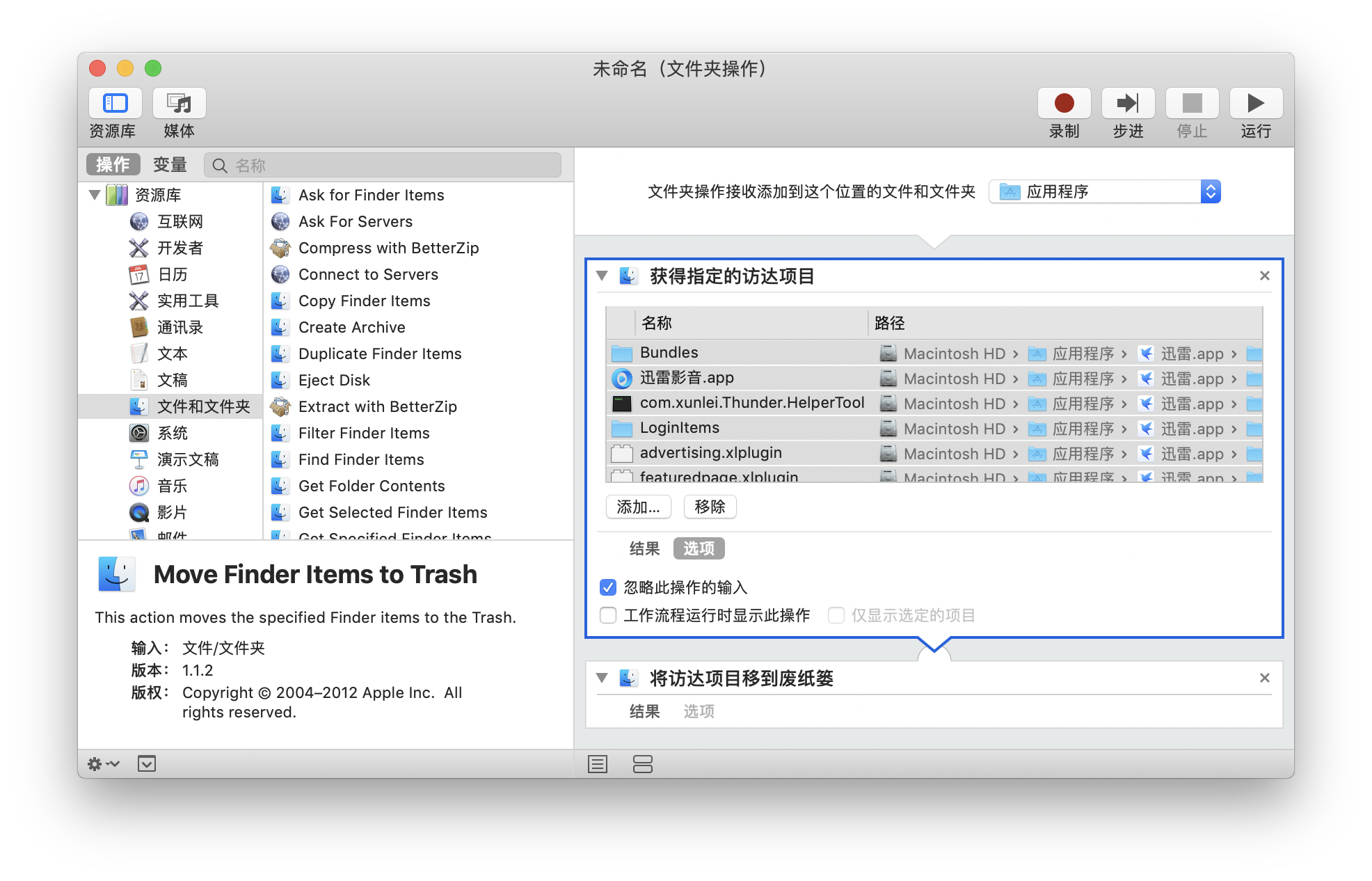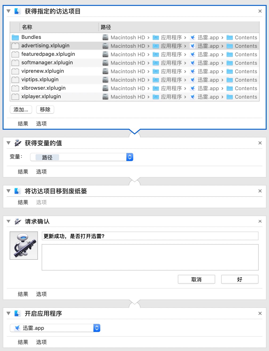 手动精简的成功充分体现了 bundle 格式的健壮性和模块化特点,但繁琐的流程仍没有发挥 macOS 强大的自动化技术。在接下来的文章中,我们将使用 Automator,通过工作流程实现安装后自动精简迅雷。