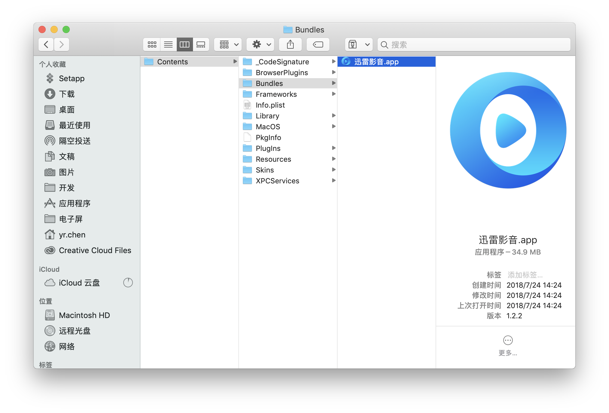 打开「应用程序」目录,你会发现迅雷影音 App 并没有被列出——这是迅雷利用 bundle 格式进行捆绑安装的成果。选中迅雷 App,在辅助菜单中点击「显示包内容」进入其内部,便会在 Contents > Bundles 目录下找到罪魁祸首迅雷影音 App。将整个目录删除,就可以请走这位不速之客了。