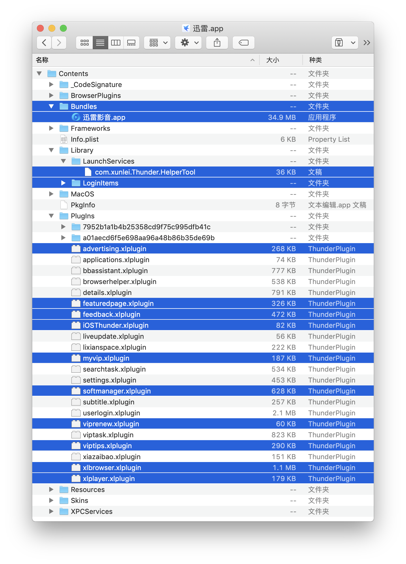 接下来是时候处理并没有什么用的首页和迅雷商店了。在迅雷 App 包目录下,找到 Contents > PlugIns 目录,里面的插件数目之多、命名之随意令人叹惋。所有插件的详情已经在下表中列出: