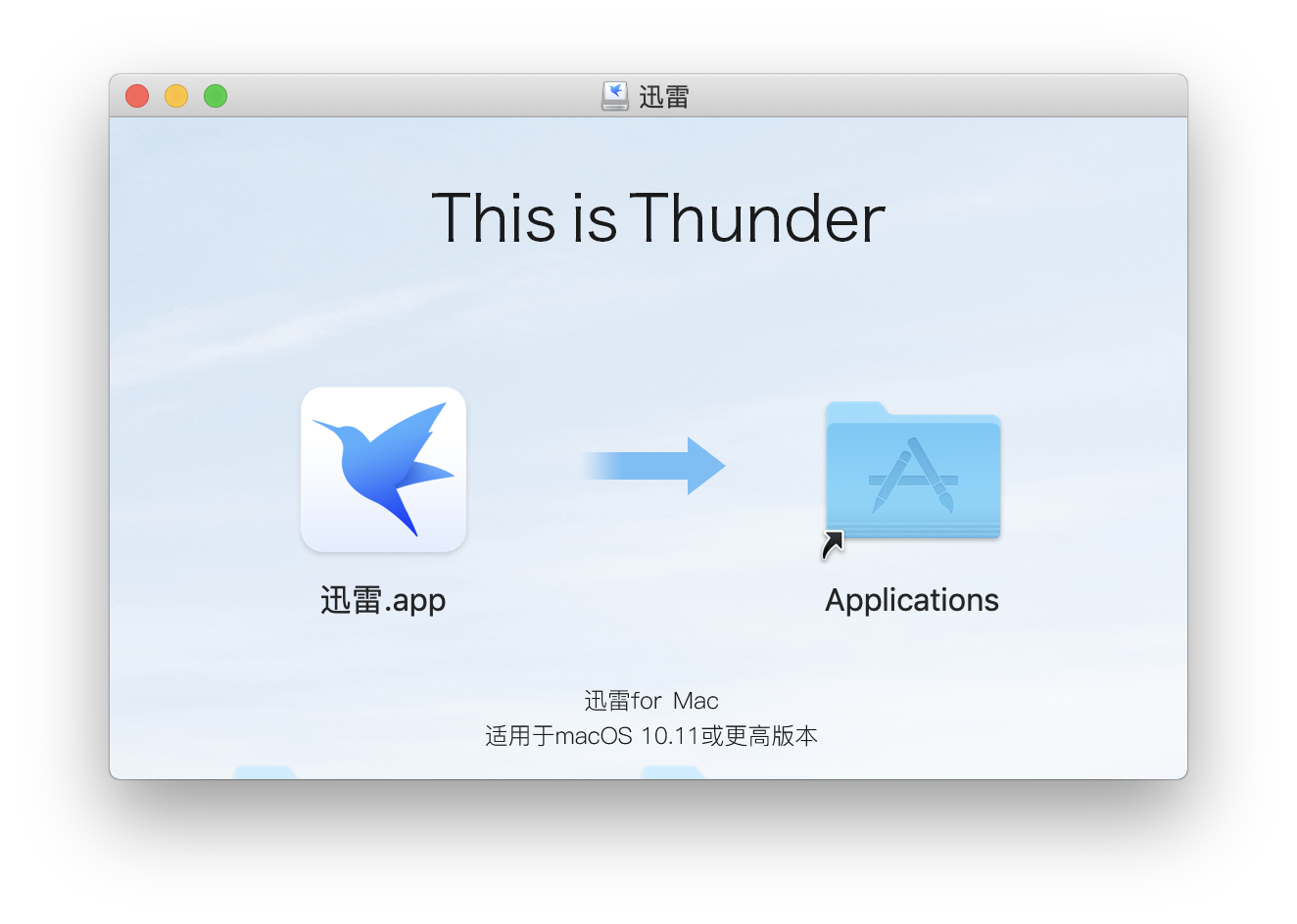 由于下载时可能写入任何目录,迅雷无法遵循沙盒权限,因此没有上架 Mac App Store。打开官网上下载的 DMG 磁盘映像,同意长到没人有耐心看的服务协议,拖动迅雷 App 到 Application目录替身上。伴随着清脆的「叮」声,迅雷已经成功地安装在了你的电脑上。