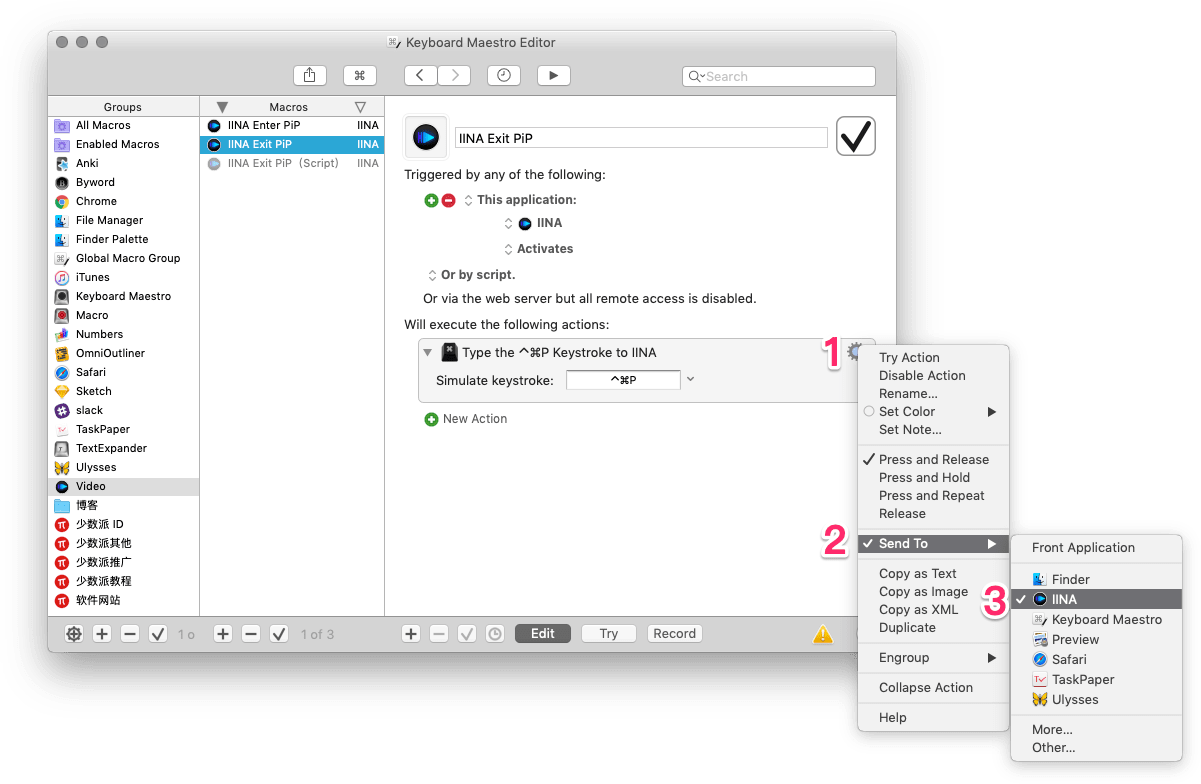 所要触发的动作都是模拟快捷键 ⌃Control - ⌘Command - P,这是 IINA 自带的快捷键,用于触发菜单栏中进出画中画的选项。需要注意的是,要在 Type Keystroke 步骤右上角的设置中选择将快捷键发送(Send To)给 IINA,才能准确控制 IINA 的菜单栏选项,而不会在离开 IINA 窗口时影响到其他应用。