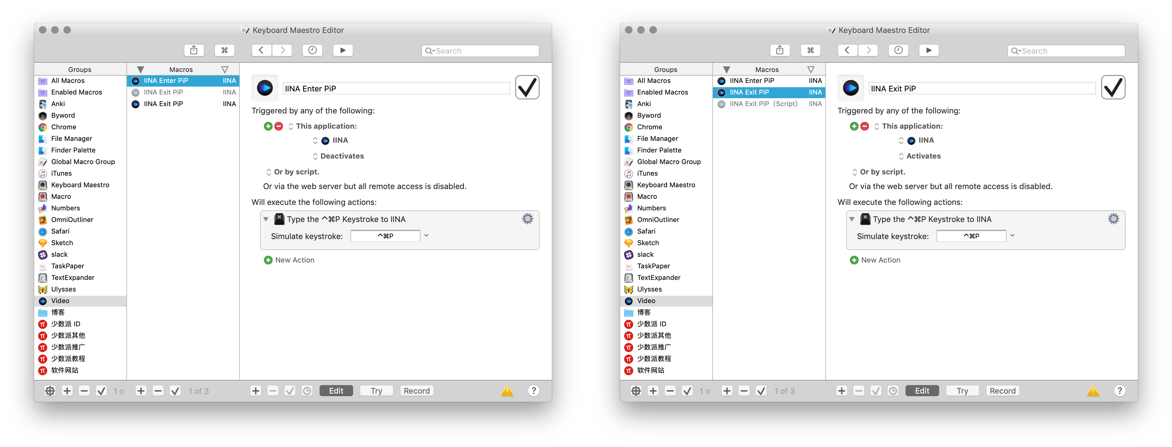 这个效果要通过两个 Macro 来实现,实际上就是根据 IINA 窗口是否处于激活状态来点击菜单栏中进入/退出画中画的选项。