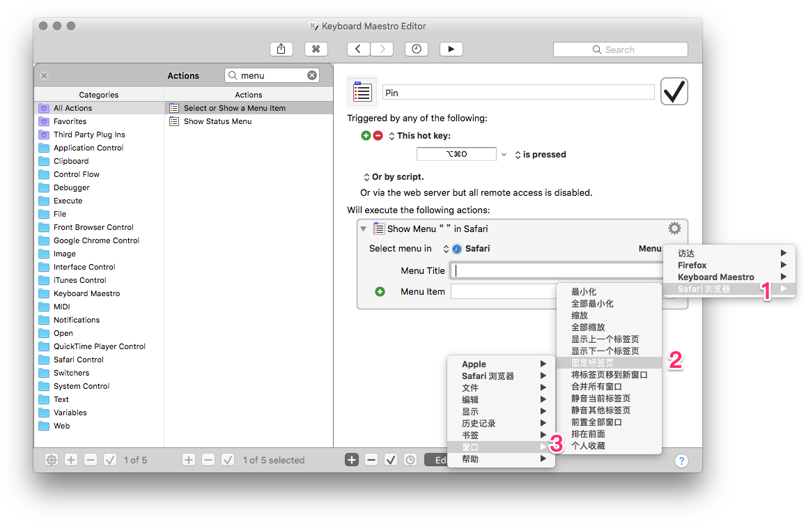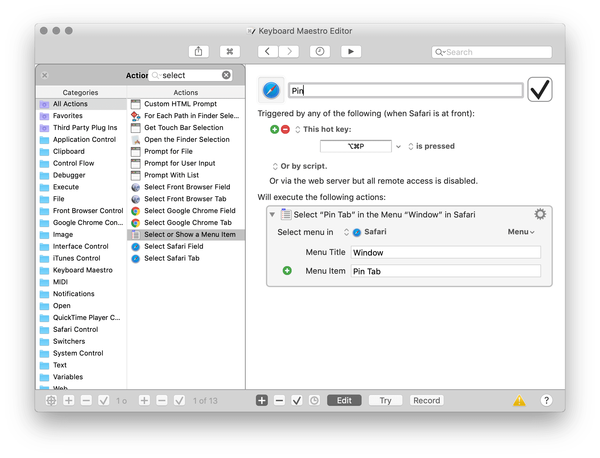 总体上说,在 Keyboard Maestro 里设置一个快捷键也是分两步走。以「为 Safari 的 Pin 功能设置 ⌥Option - ⌘Command - P 快捷键」为例: