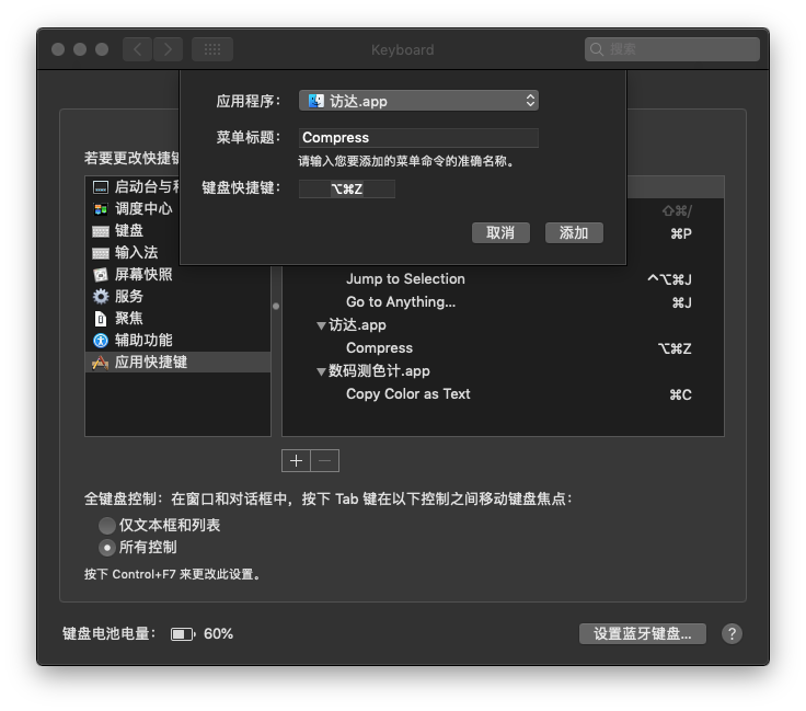 在弹出的界面中选择菜单选项所在的应用程序(默认是所有应用),输入菜单选项标题和想要的快捷键,就完成设置了。注意菜单栏标题不能填错,不然快捷键不起作用。