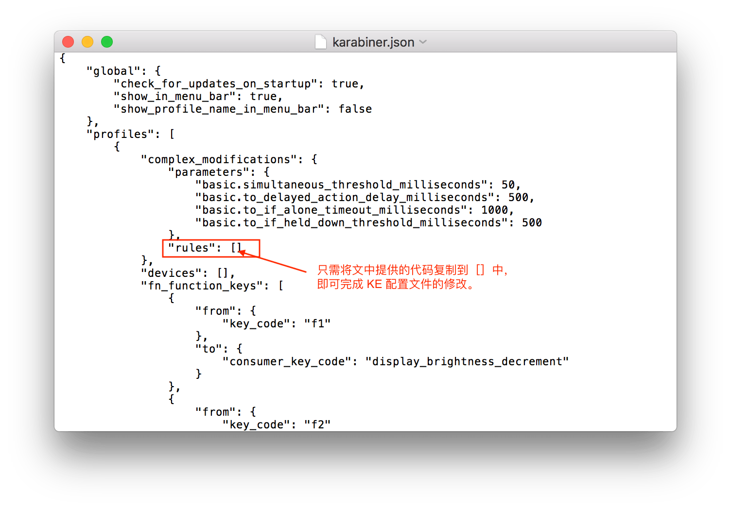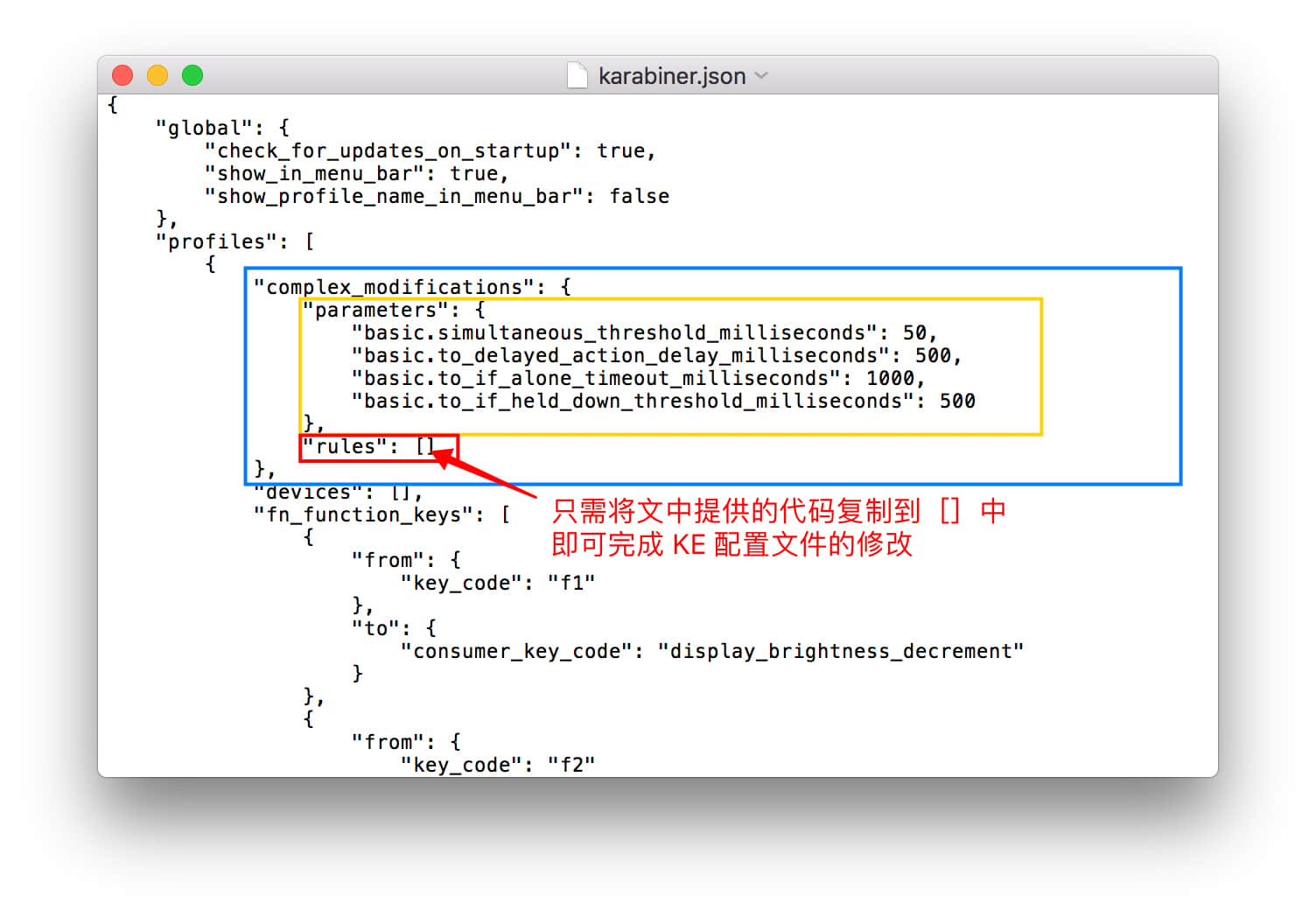 只需复制下文中提供的代码,粘贴到红色方框中方括号 [] 里,我们就完成了 KE 配置文件的修改。这里是修改后的配置文件 karabiner.json,大家可以参考,也可以拿来直接使用。 {