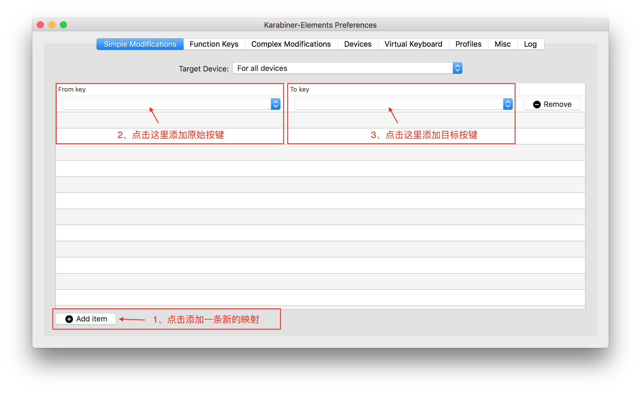 想要实现这条映射也很简单,打开 KE,在「Simple Modifications(简单映射)」下,点击左下角「Add item(添加映射)」,然后在「from key(即原始按键)」中选择 Caps Lock,在「to key(即目标按键)」中选择 Esc,我们的第一条映射就创建成功了。