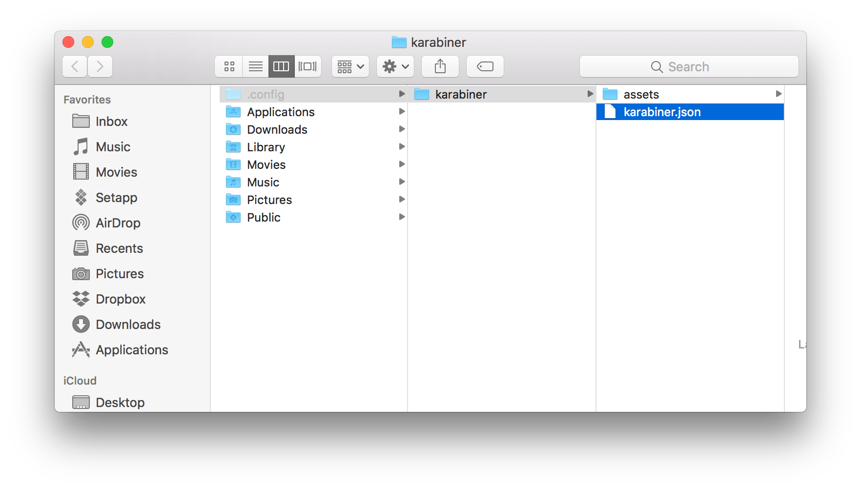 KE 配置文件是 karabiner.json,默认路径是 ~/.config/karabiner/karabiner.json。复制好路径后,打开「访达」,在顶部状态栏点击「前往 - 前往文件夹」,粘贴路径前往后就找到了 KE 配置文件。