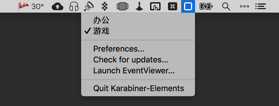 比如创建游戏、办公两个配置。游戏配置里 Caps Lock 改为技能释放键9 ,办公配置中则将 Caps Lock 改为 Esc。使用时可以通过状态栏快速切换到相应配置。