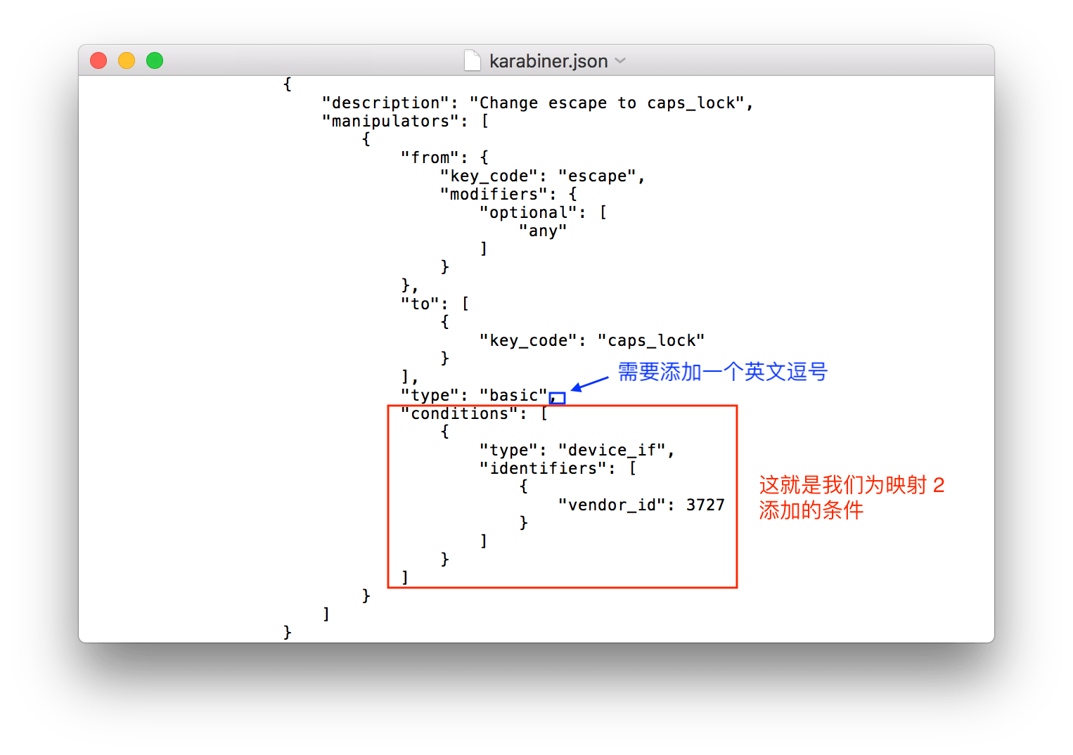 写好后,将这段代码添加在映射 2 输出部分的最后,另外,因为 JSON 的数据结构,需要在上一行结尾加一个英文逗号 ,。这样,我们就为映射 2 添加了一个条件,使其只作用在外置键盘上。