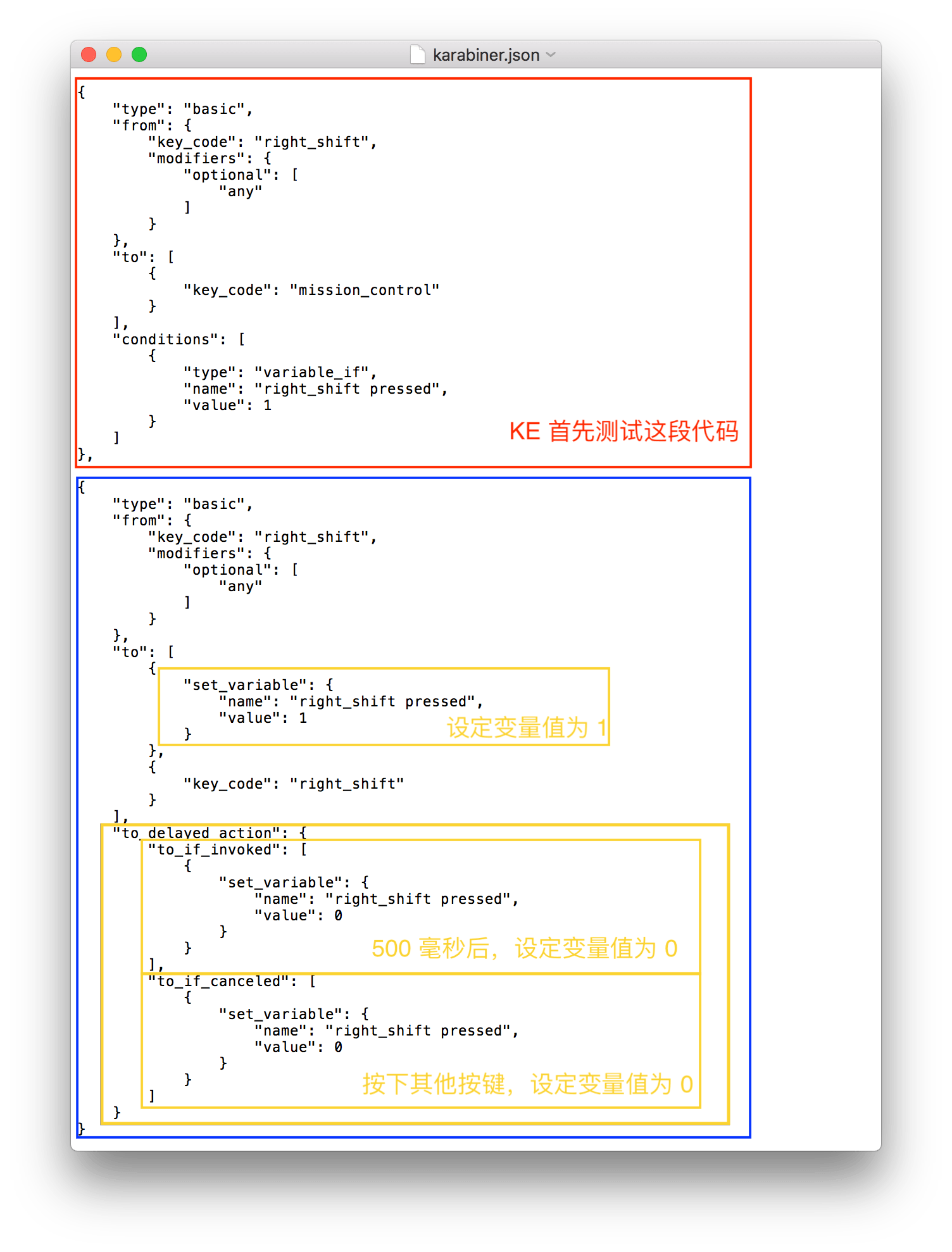 若 500 毫秒内再次按下右侧 ⇧Shift,变量 right_shift pressed 值仍为 1,所以红色框中代码执行,输出 misson_control 键。500 毫秒后,to_if_invoked 动作执行,将变量 right_shift pressed 值清零。