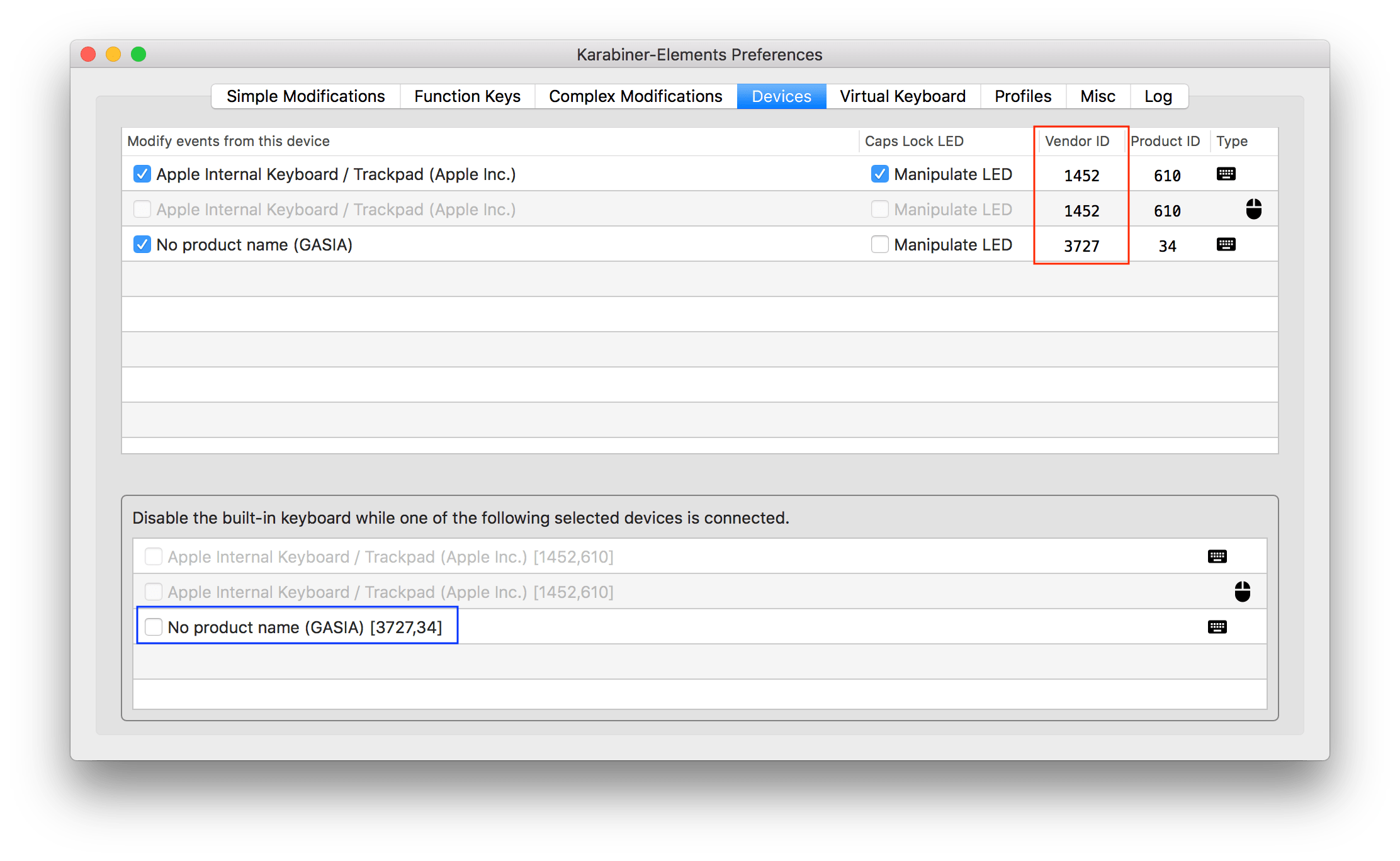 在红色标记中找到外置键盘的 Vendor ID,图中为 3727,该数值,这就是我们要找的条件。一般情况下,我们只需要 Vendor ID 或者 Product ID 中的一个即可。