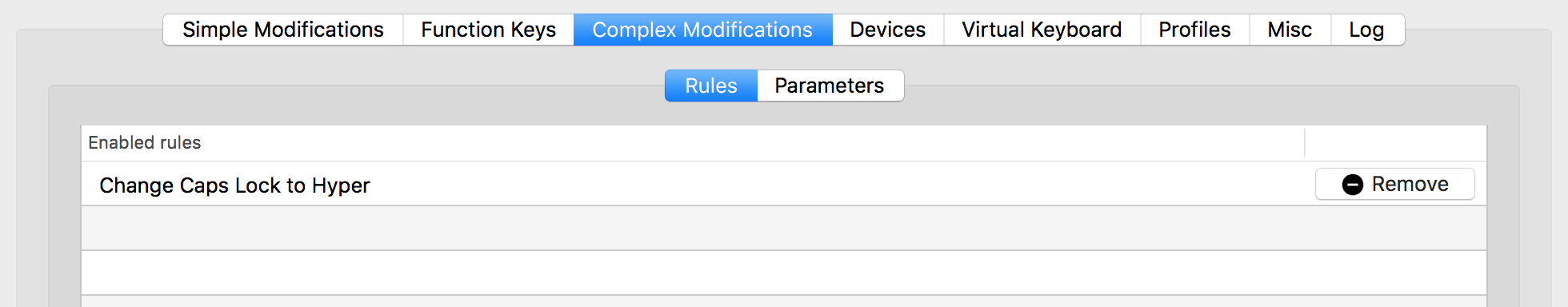 这个做法和之前的简单映射有所不同,属于复杂映射。所以我们需要切换到「Complex Modifications(复杂映射)」选项卡,这里有两个选项卡,「Rules(映射1 )」和「Parameters(参数)」。我们暂时不看「参数」,先看「映射」。