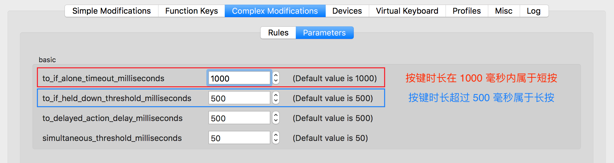 切换到「复杂映射」下的「参数」选项卡,这里有四条参数,我们只需关注前两条参数。因为我们将按下 Caps Lock 键分为了短按和长按,所以我们需要告诉 KE 多长时间内是短按,超过多长时间是长按,这两条参数就是控制这些时间的。