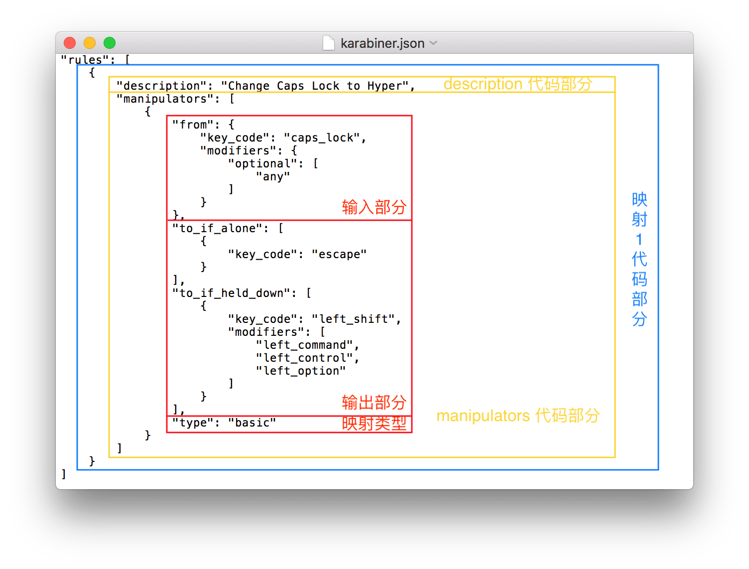 对照图片可以看出,"complex_modifications": {} 中代码分为两部分: