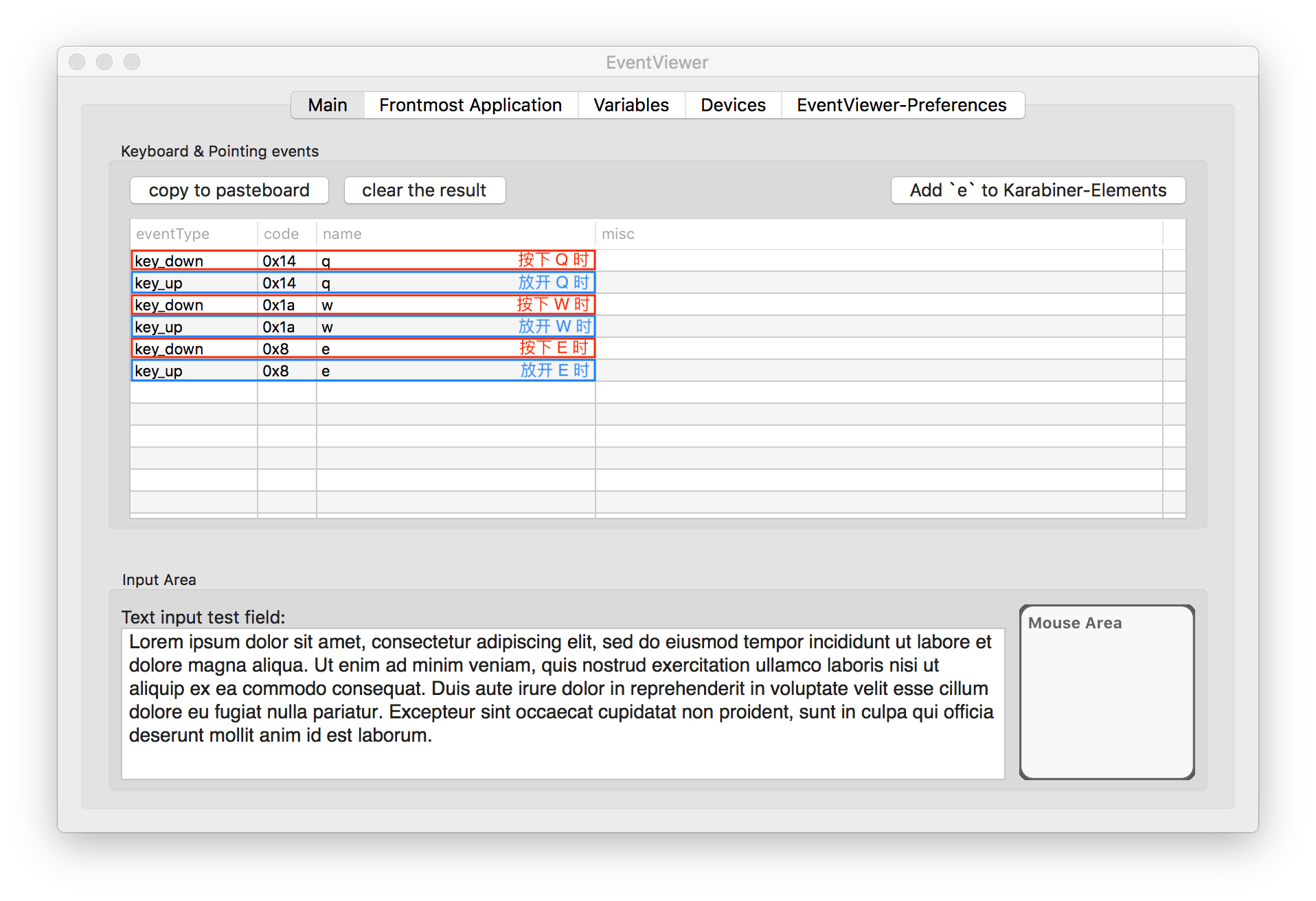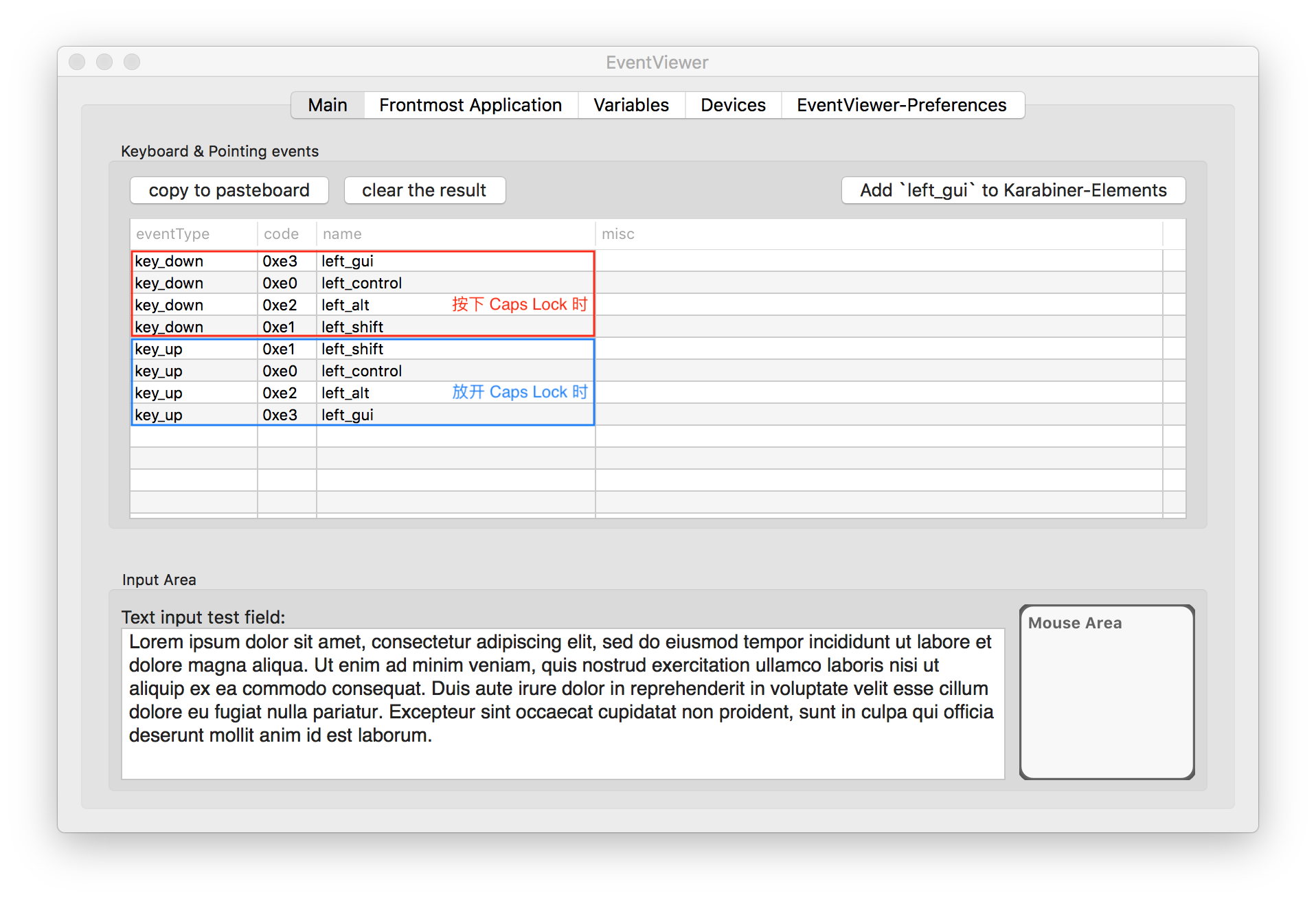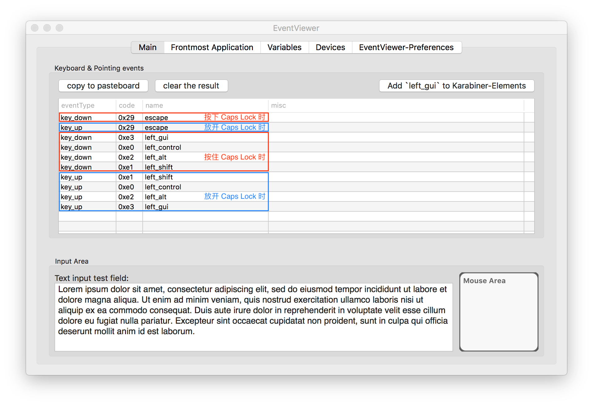 这是一个简单映射,我们直接在「简单映射」里添加好后,打开 EventViewer 检验一下。当我们按下 Esc 时,出现的结果并不是我们期待的 Caps Lock,而是 Esc;当我们长按 Esc 时,发现却是组合键的效果。