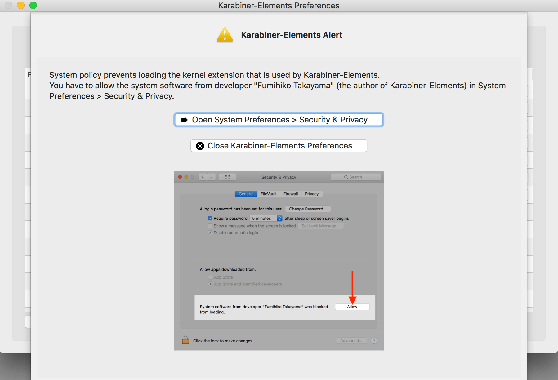 第一次打开 KE 会出现一个弹窗,提示我们系统阻止了 KE 的内核扩展。这是因为 KE 直接作用于底层硬件,所以需要我们手动允许。按照提示,点击「Open System Preferences - Security & Privacy」跳转到设置界面,再点击「允许」即可。