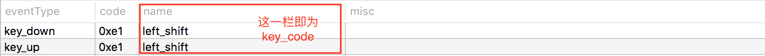 key_code 是按键名称,用来告诉 KE 要监测和执行的按键是什么。key_code 可以在 EventViewer 中查看。比如按下左侧 ⇧Shift,EventViewer 中 name 一栏显示的 left_shift 就是左侧 ⇧Shift 的 key_code。