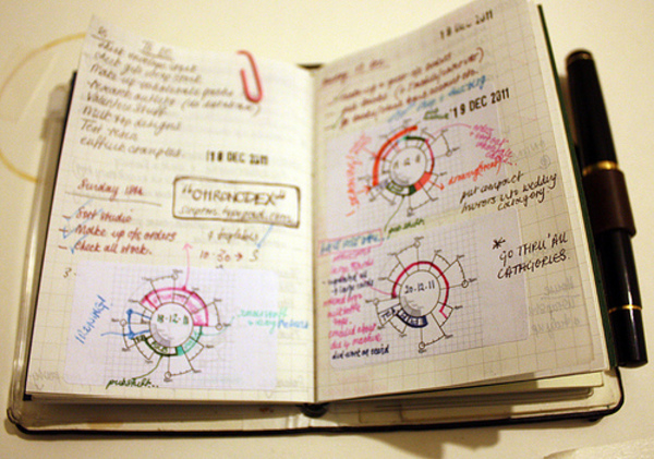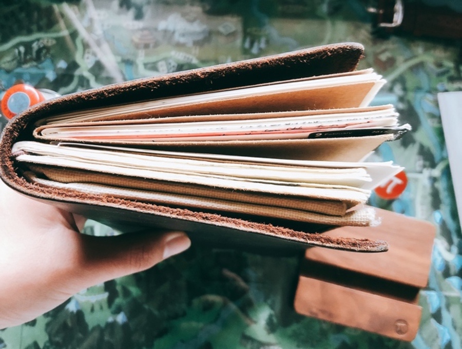 简洁之外,本子还要足够厚实,省得频繁换本子。Moleskine、Hobo 等比较受欢迎的手账本往往只有半本课本大小,每页能记的内容不会太多,不过可以通过增加本子的厚度来弥补。比较讲究的读者可以考虑内芯可换的款式,我用过 的 TRAVELER‘s notebook 就是这种型号,每写完一个季度就可以加一本新内芯、归档最旧的内芯,这样就能随时回溯一年前的记录、又不至于把手账撑得像砖头。