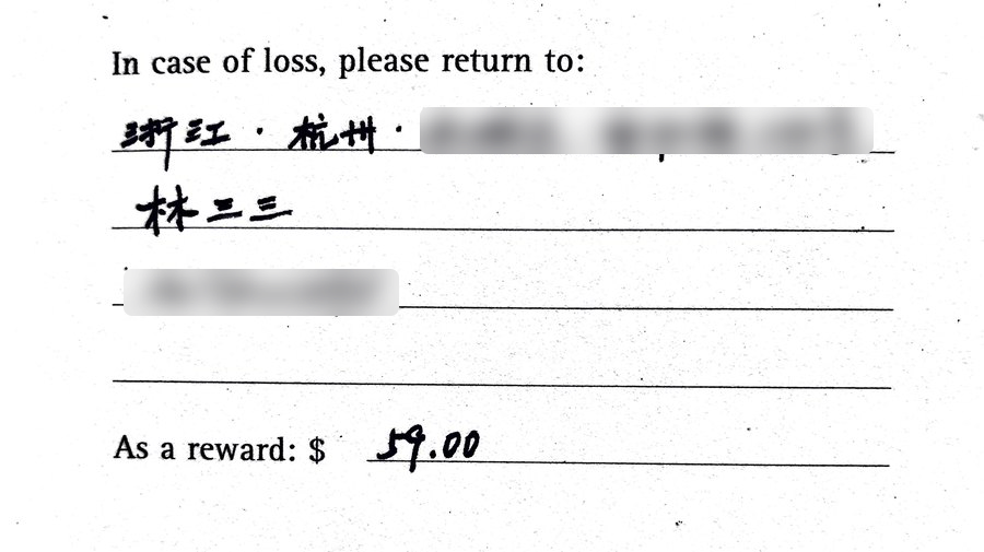 失主信息:这个设计我最早在 Moleskline 的记事本里看到。本子的第一页就写着收件地址、联系方式和为归还者提供的报酬,和学生作业簿上封面上的姓名栏有点像。也许填上这些信息后,丢失手账后找回来的几率更大一些。