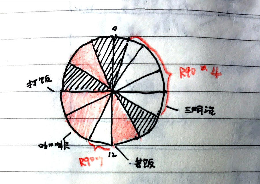 记录睡眠周期(参考《睡眠革命》的 R90 方法,一天睡 5 个周期):在圆环外围画括弧,表示这段时间在睡觉;